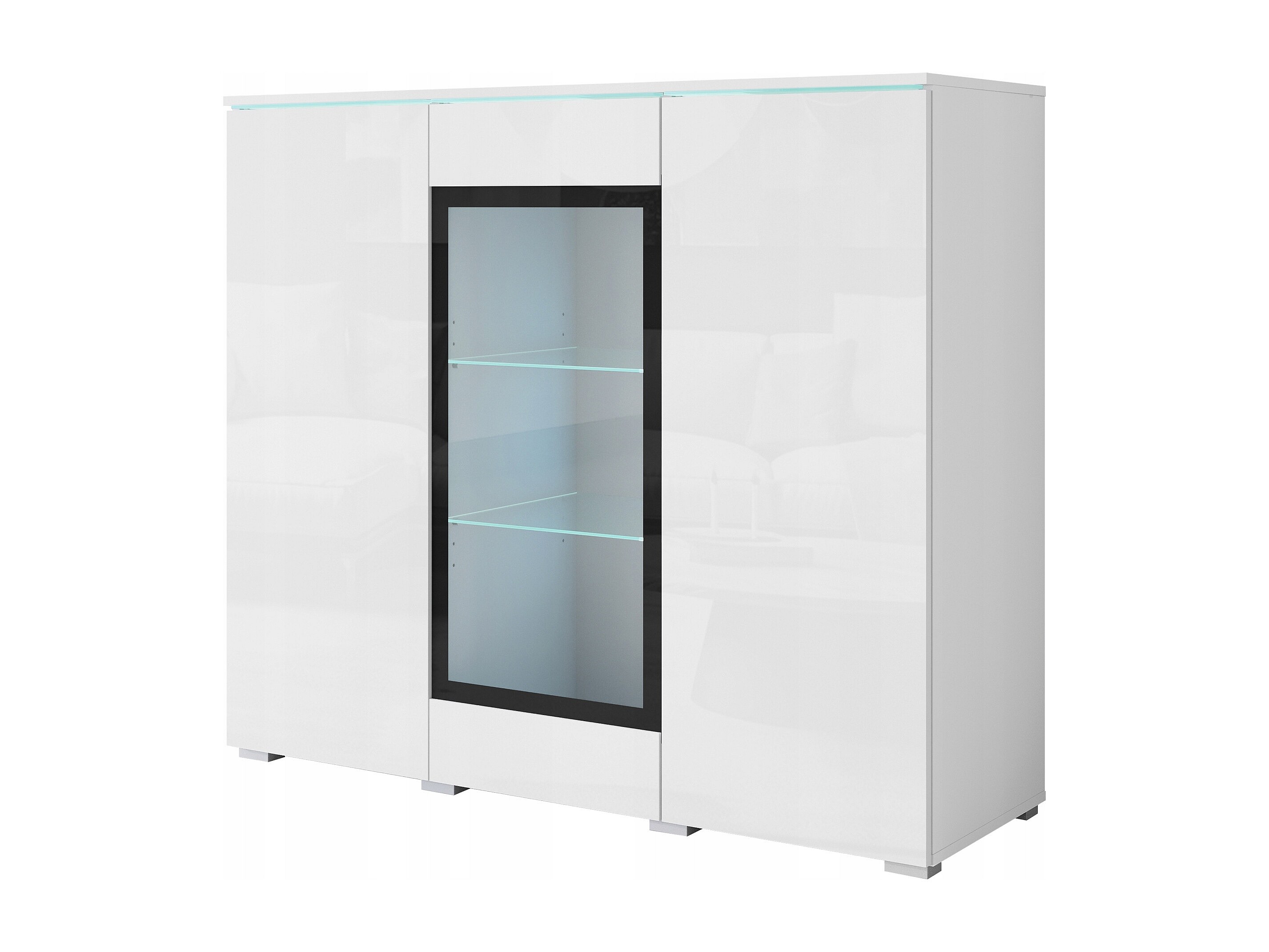Vitrina alta moderna 120 cm para salón con LED, 3 puertas, cuerpo blanco mate, frentes blanco brillo