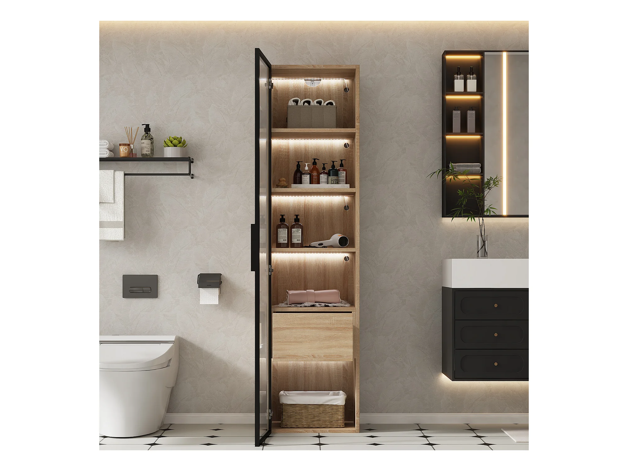Vitrina, aparador alto con 1 puerta de cristal y 1 cajón interior - 40 X 34,5 X 165 cm - Madera MDF - Natural