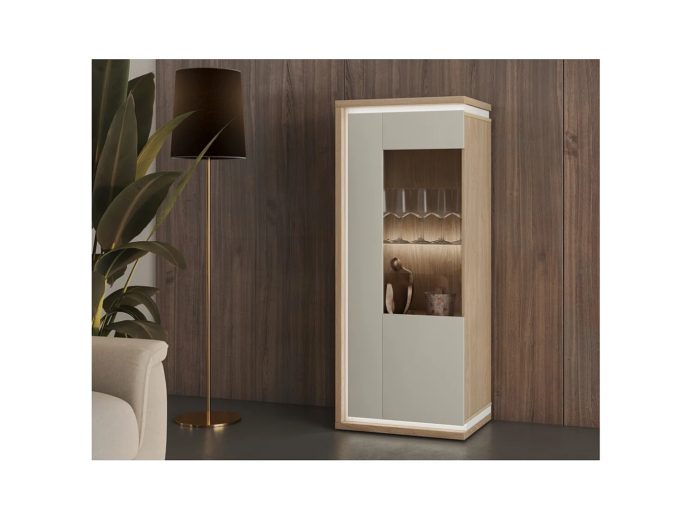 Vitrina alta JULIA 1 puerta – Roble aceitado y beige cachemira con iluminación LED integrada