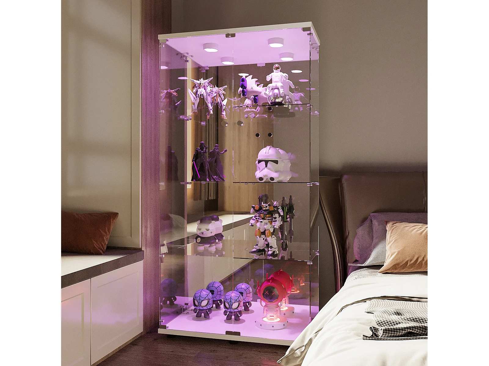 Vitrina bar de cristal templado con doble puerta, 4 estantes e iluminación LED – Mueble de almacenaje y exposición moderno en color blanco