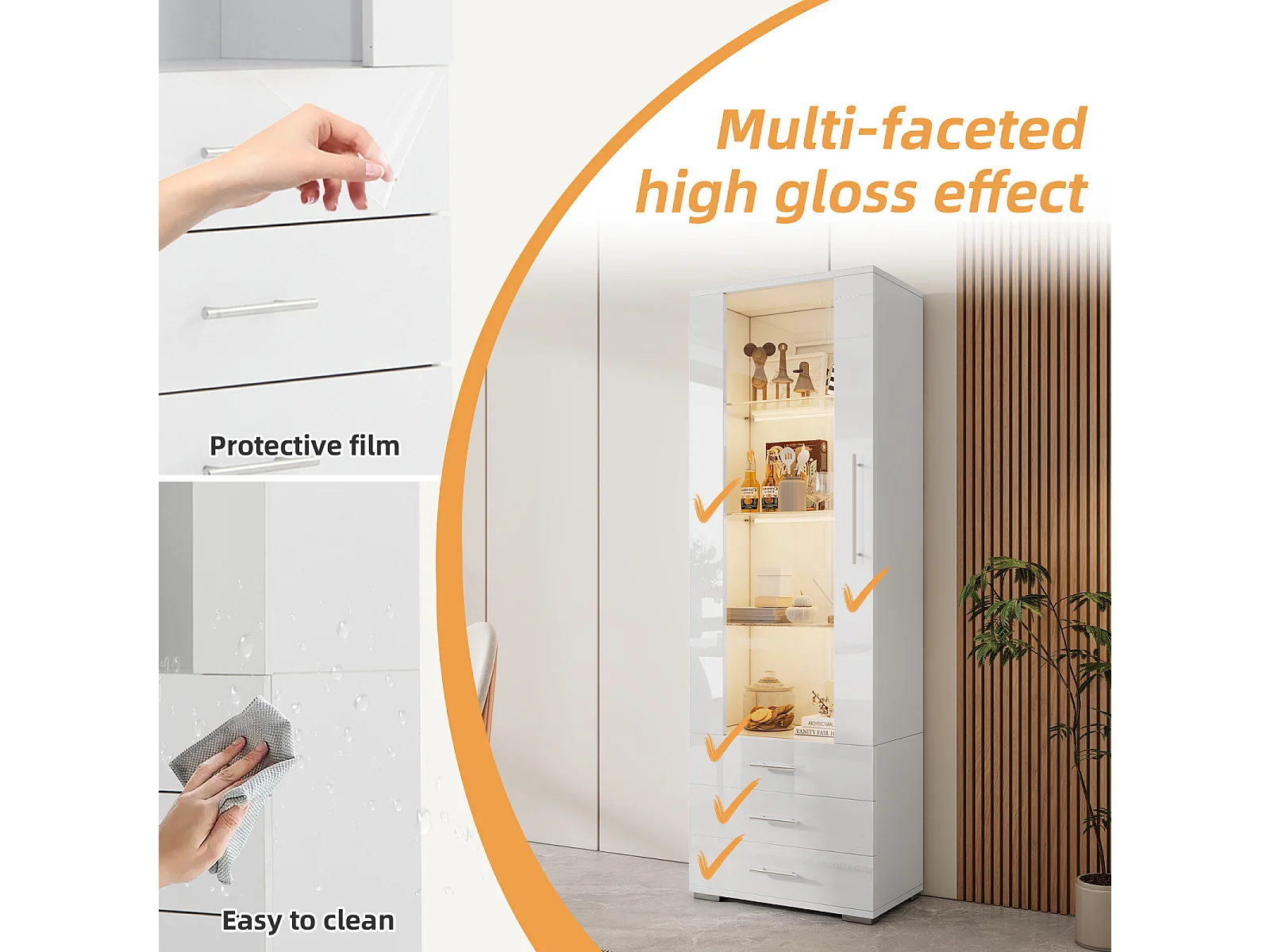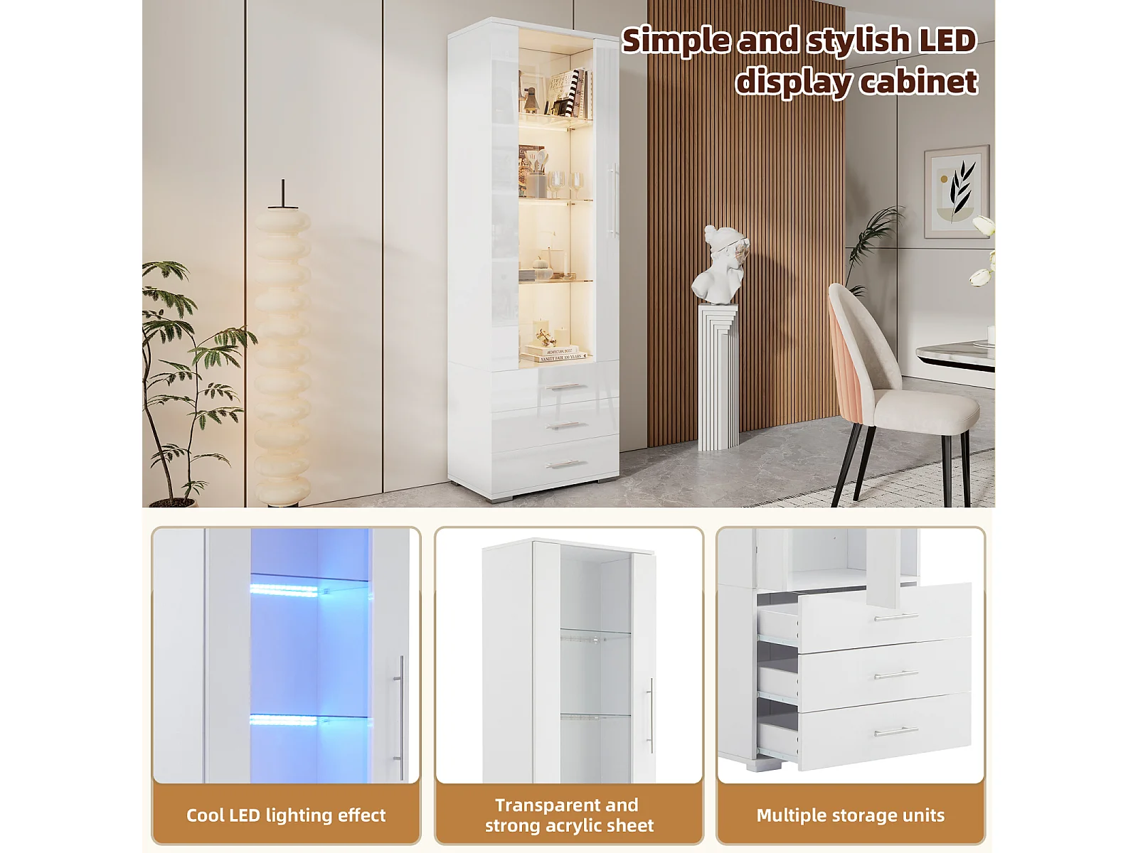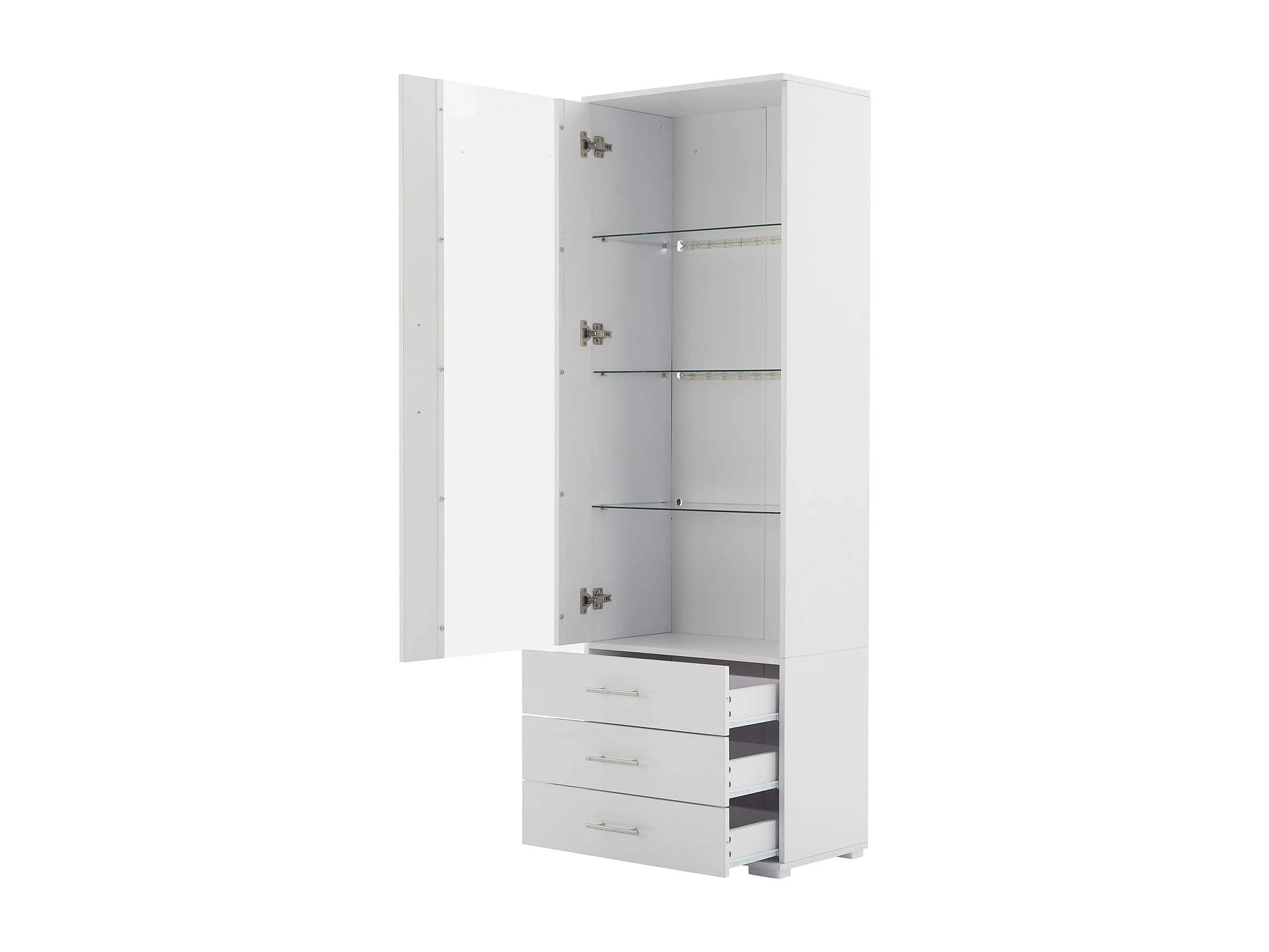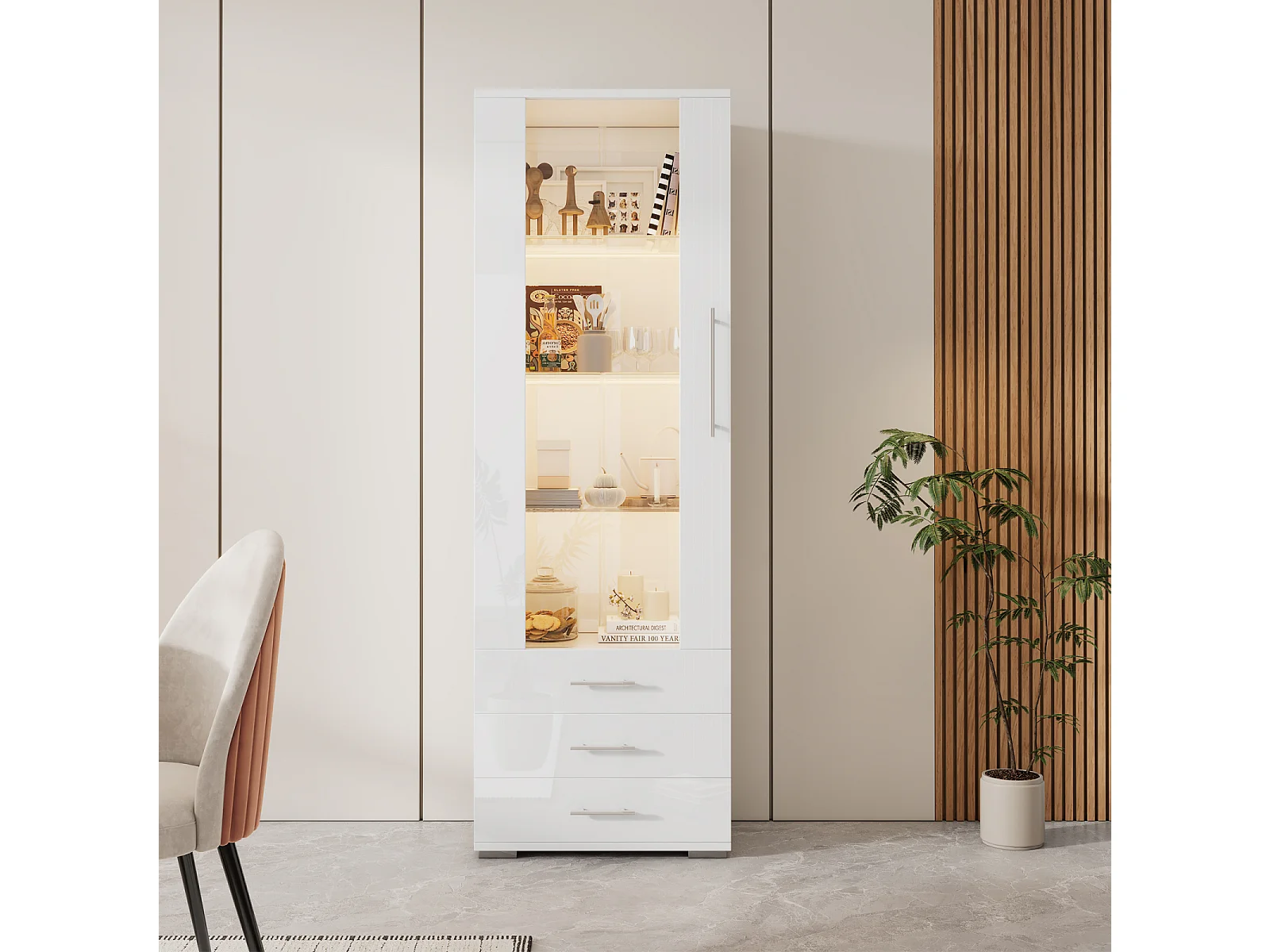 Vitrina blanca alto brillo con LED y 3 cajones, vitrina vertical 60x35x180 cm para salón