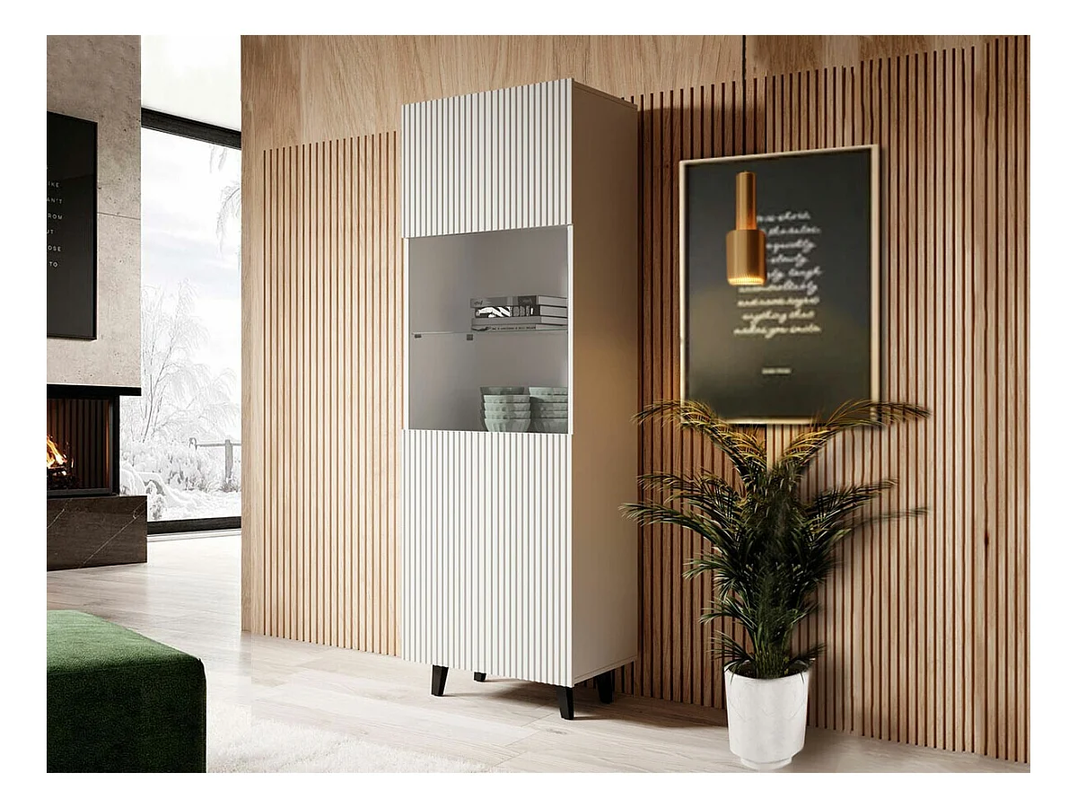 Vitrina Dvecchi, Aparador de exposición, Vitrina multiusos, Aparador de salón, 89x36 h203 cm, Blanco y Roble
