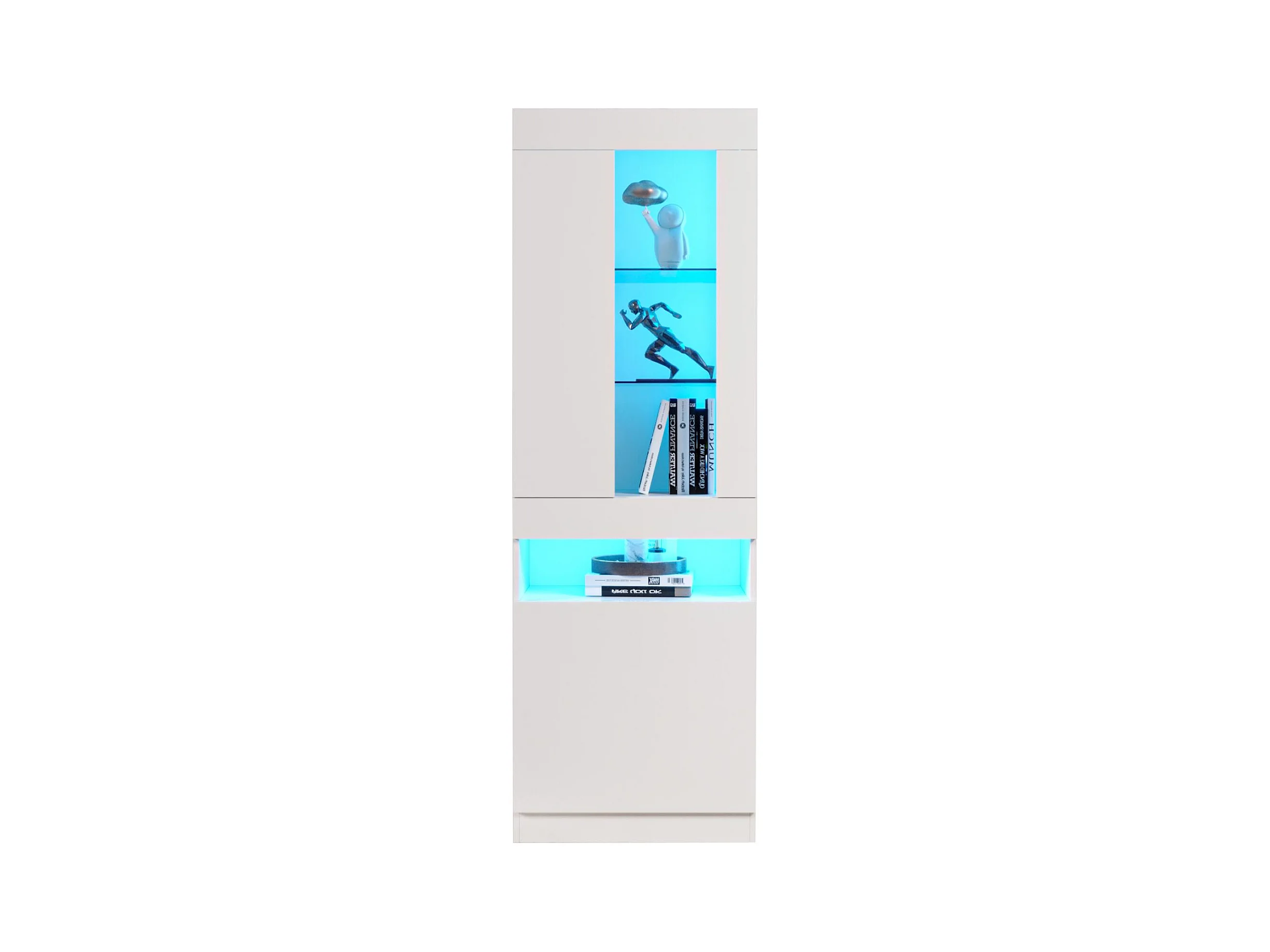 Vitrina Cómoda Morena, cuerpo en blanco mate/ puerta derecha e inserción en blanco de alto brillo con iluminación LED