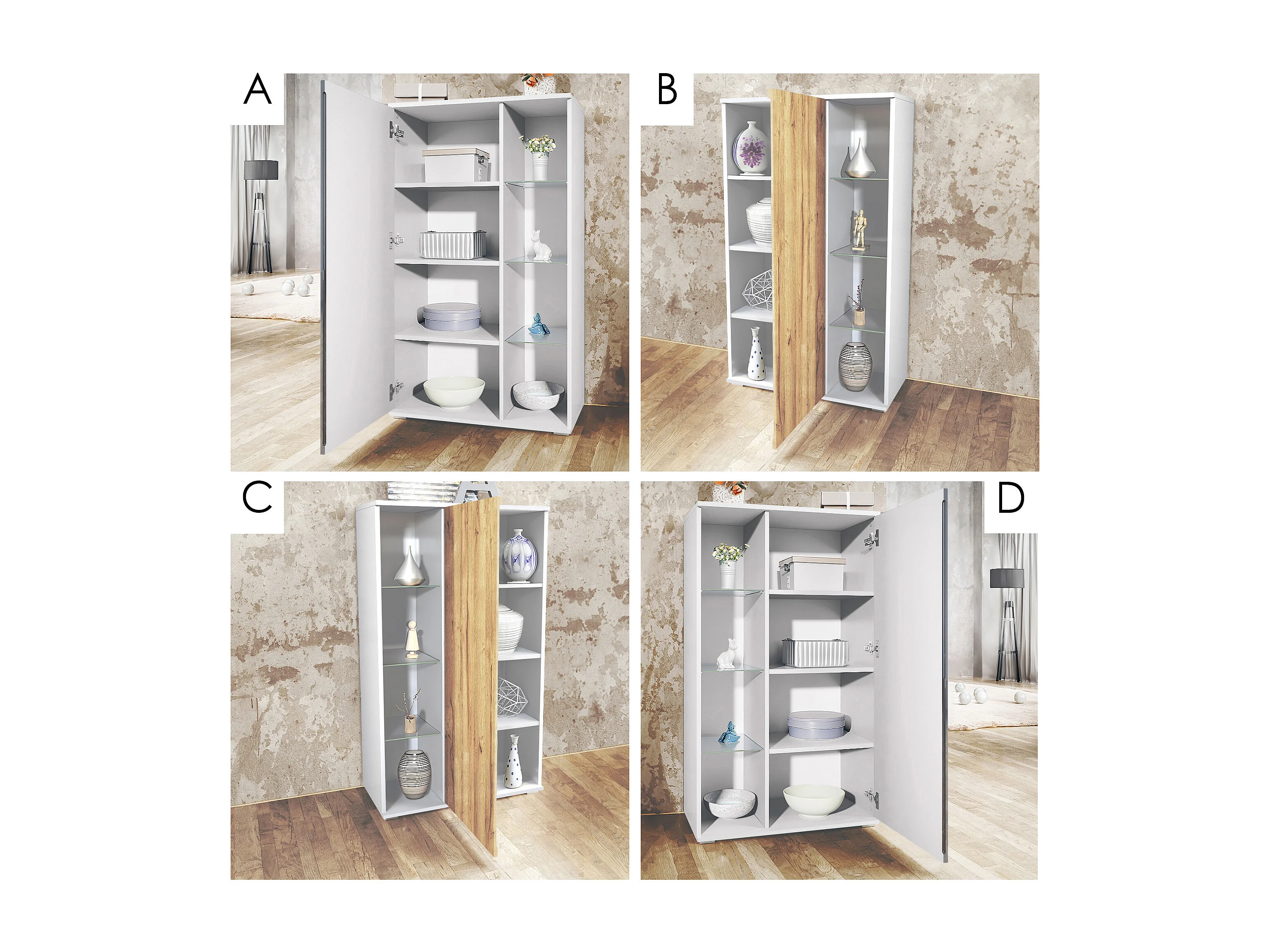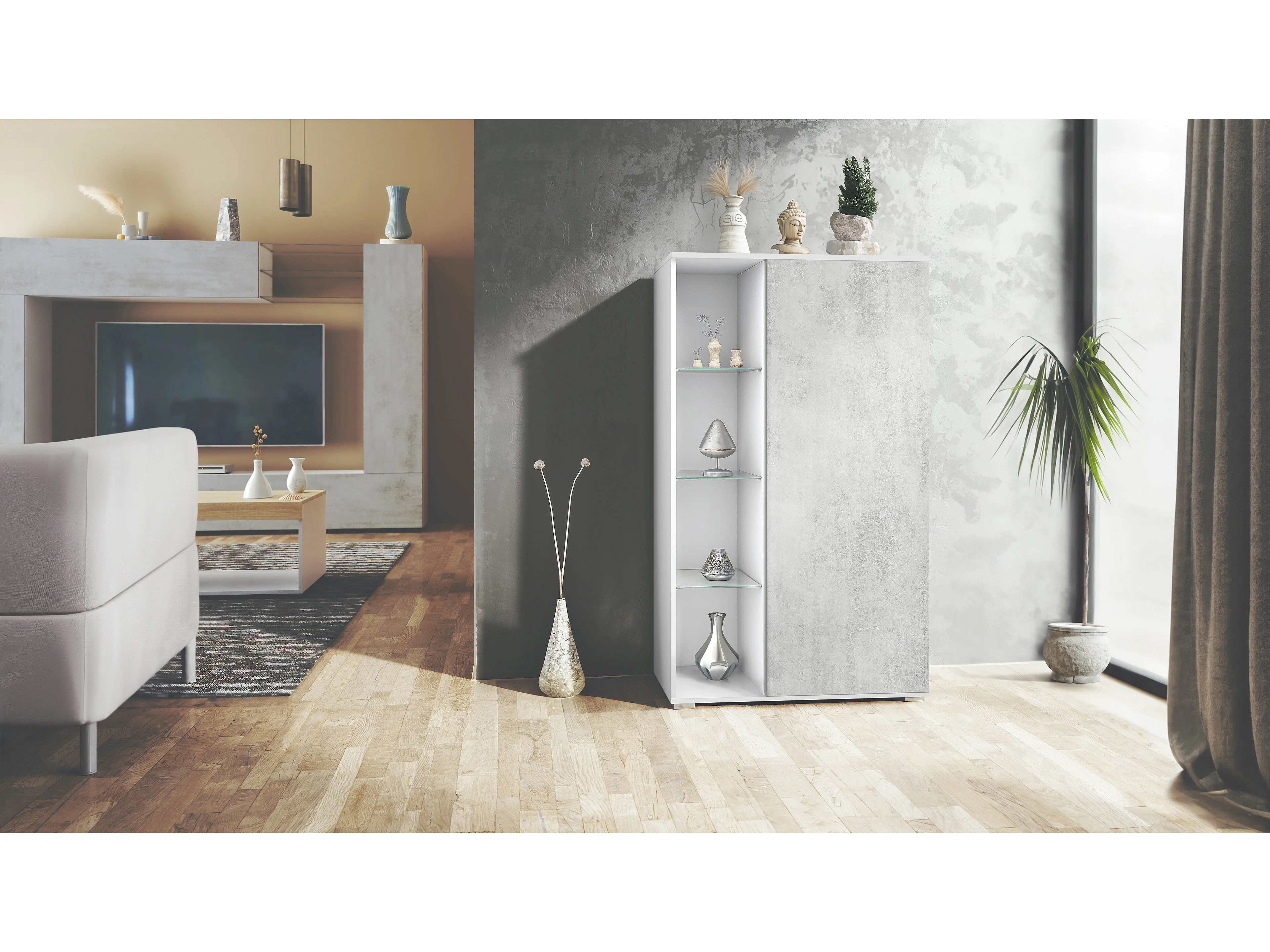 Vitrina Davos, vitrina independiente con 3 estantes de cristal y 8 compartimentos incl. LED, blanco mate/hormigón oxidado (71,5 x 134 x 35 cm)