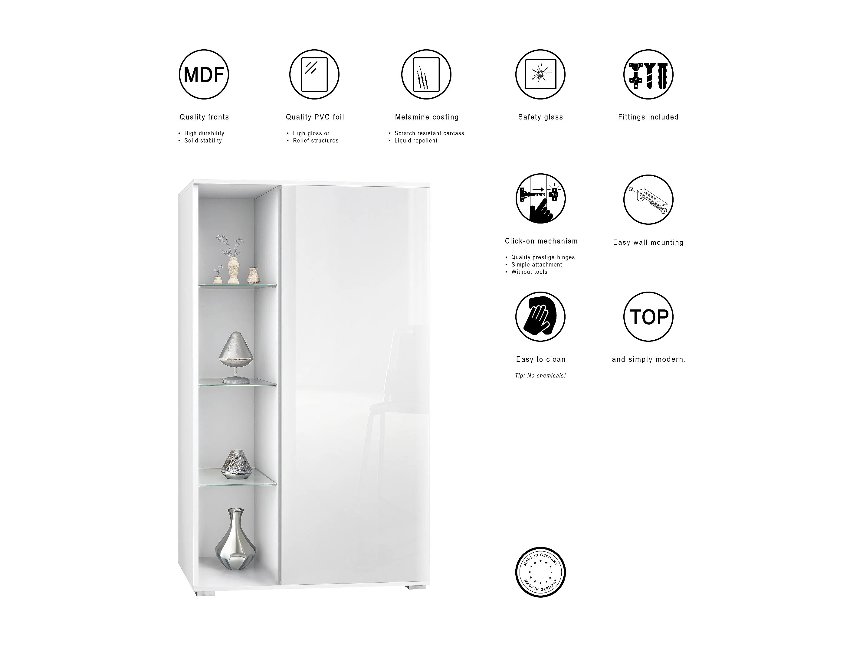 Vladon Vitrina Denjo, Cristalera con 2 Puertas y 3 Estantes de cristal, Blanco mate/Blanco de alto brillo/Hormigón oxidado (71 x 129 x 35 cm)