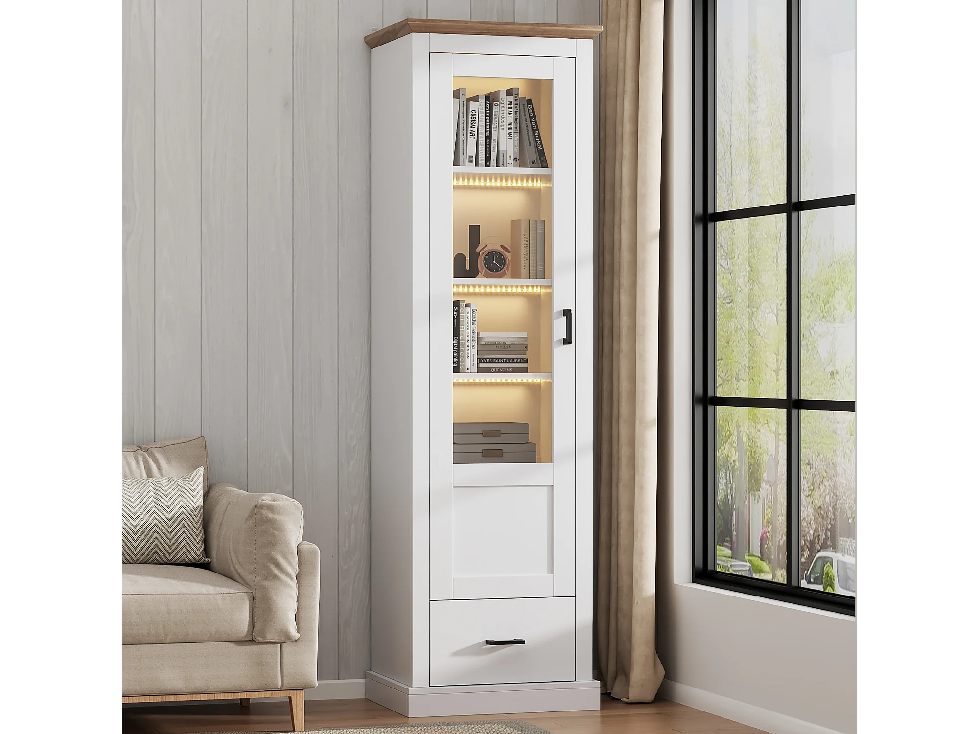 Vitrina LED 5 estantes panel de madera blanca con cajón USB moderna sala de estar dormitorio 178cm