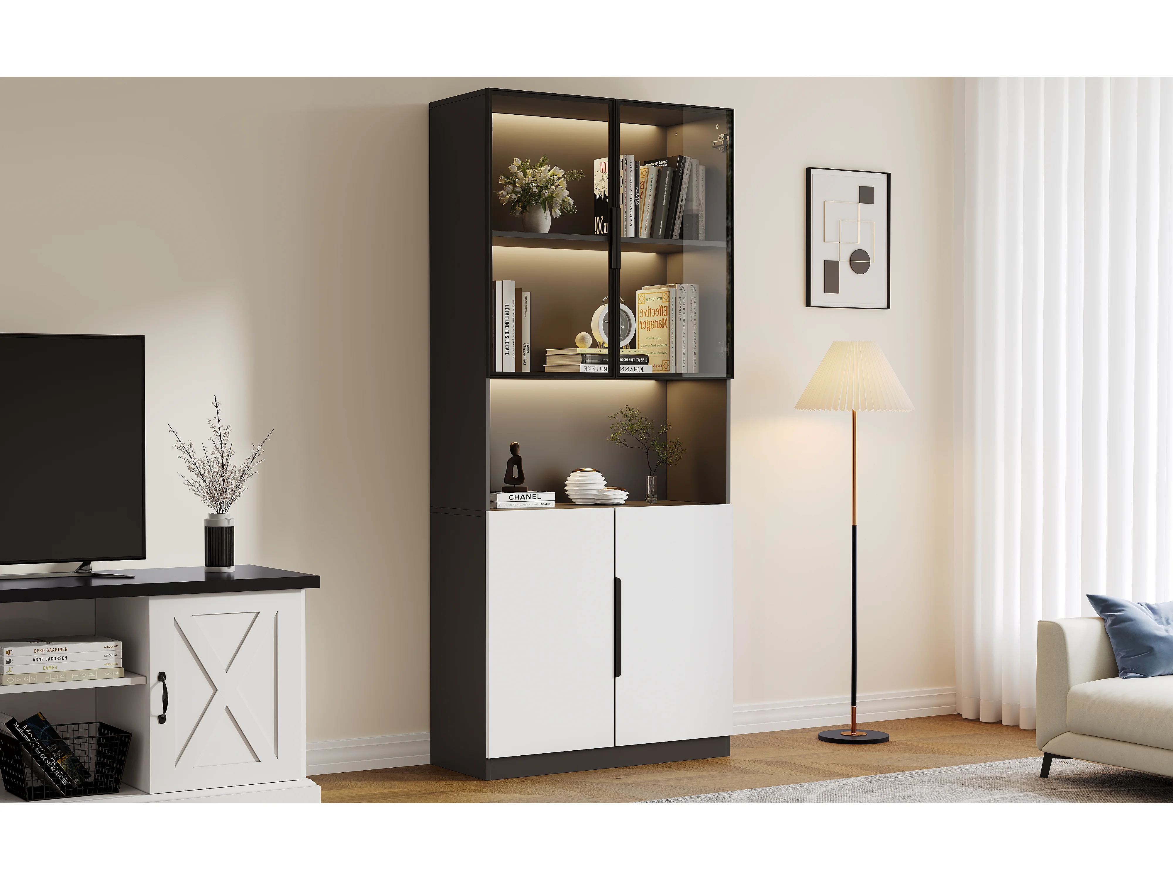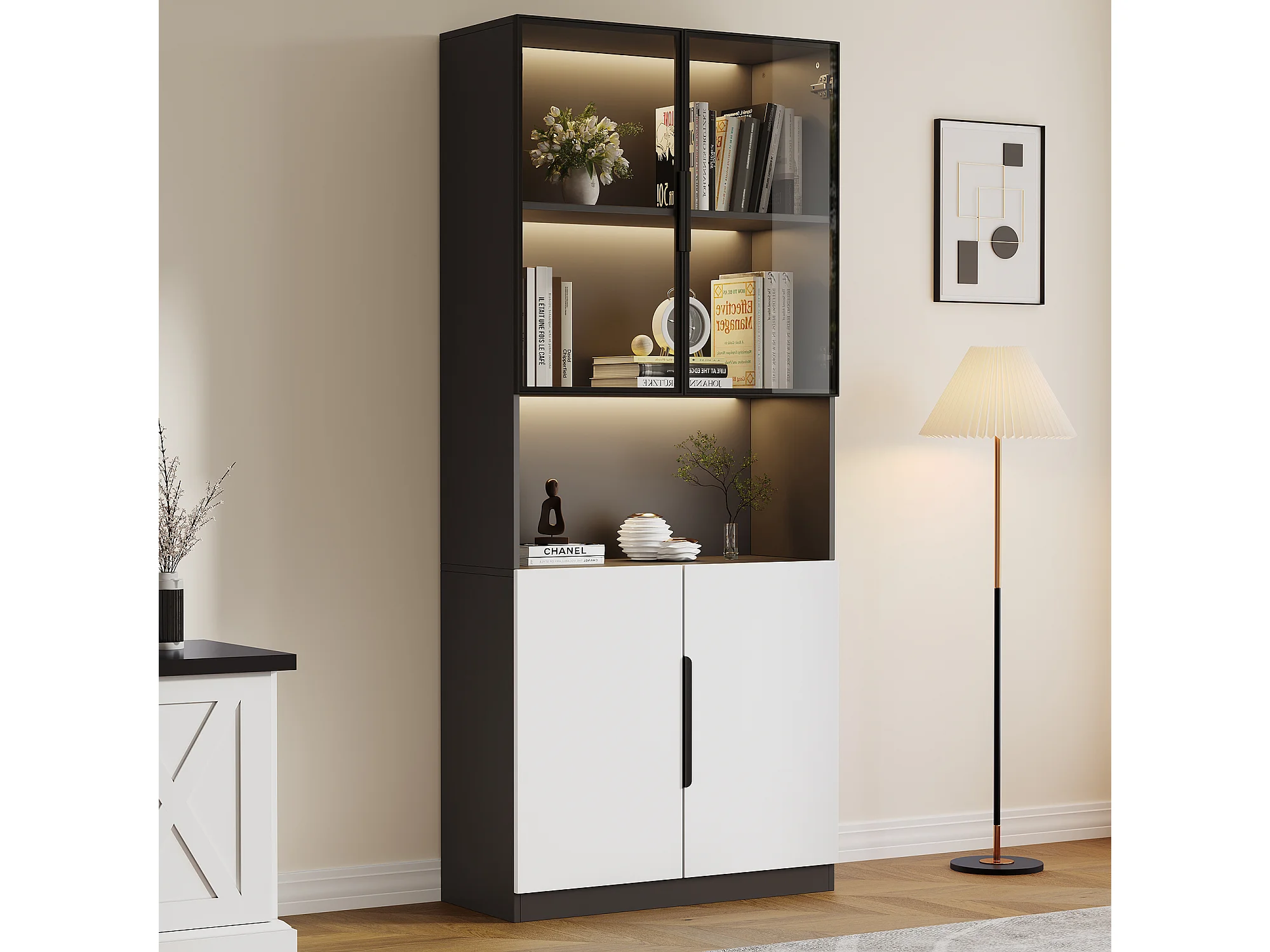Vitrina LED con 4 puertas y estantes regulables, MDF, Blanco y Negro (160x30x200 cm)