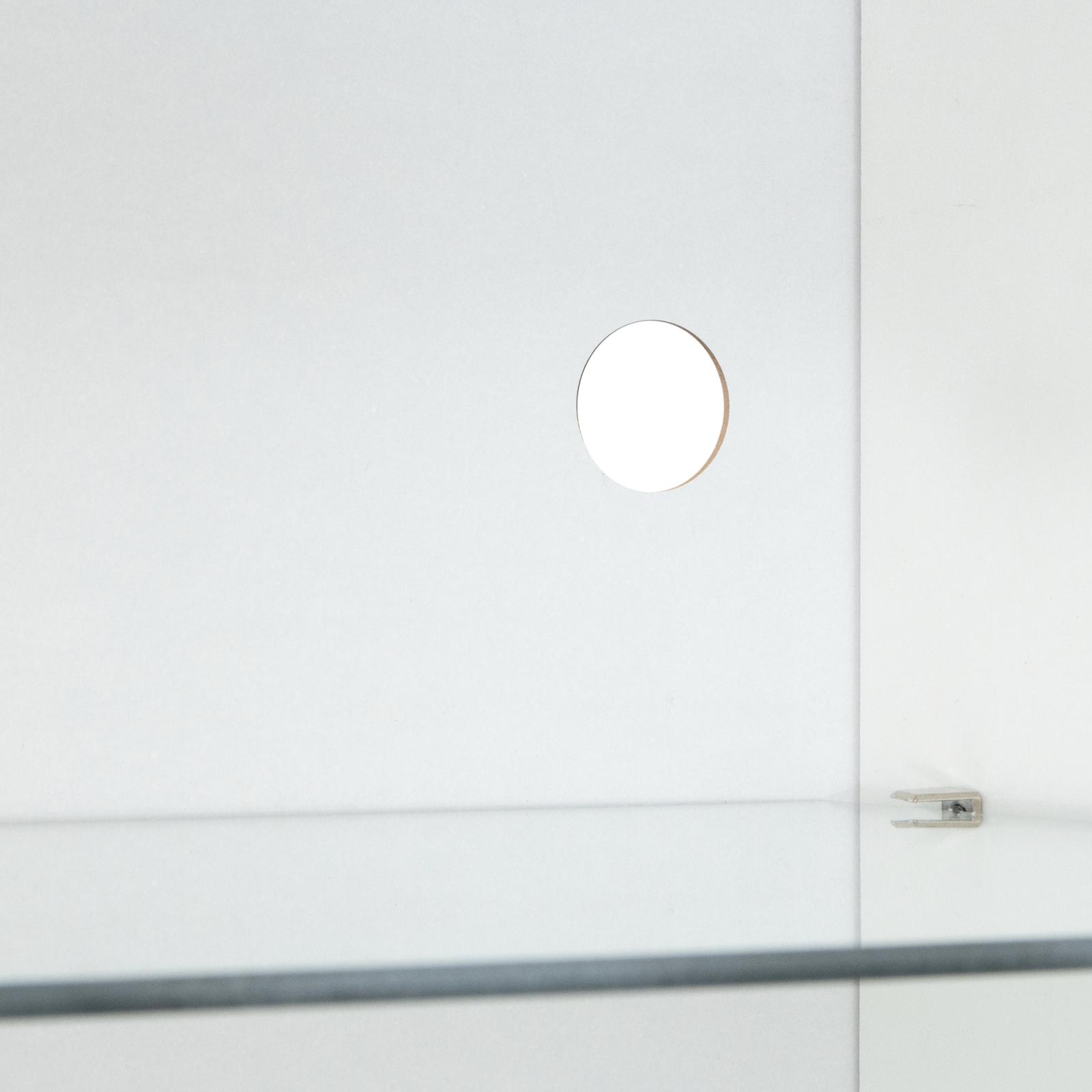 Armario multifunción, estantería y vitrina en cristal templado con estructura de aluminio, 1 puerta, 1 cajón lateral, con ruedas e iluminación LED.