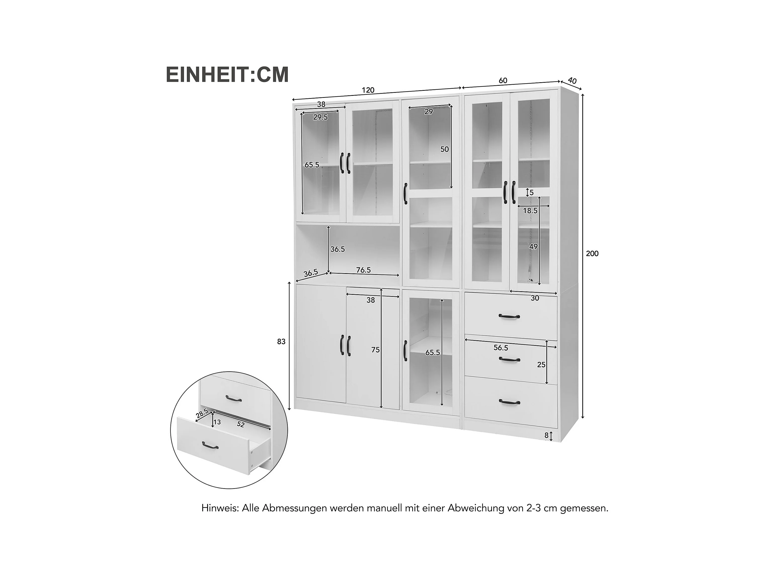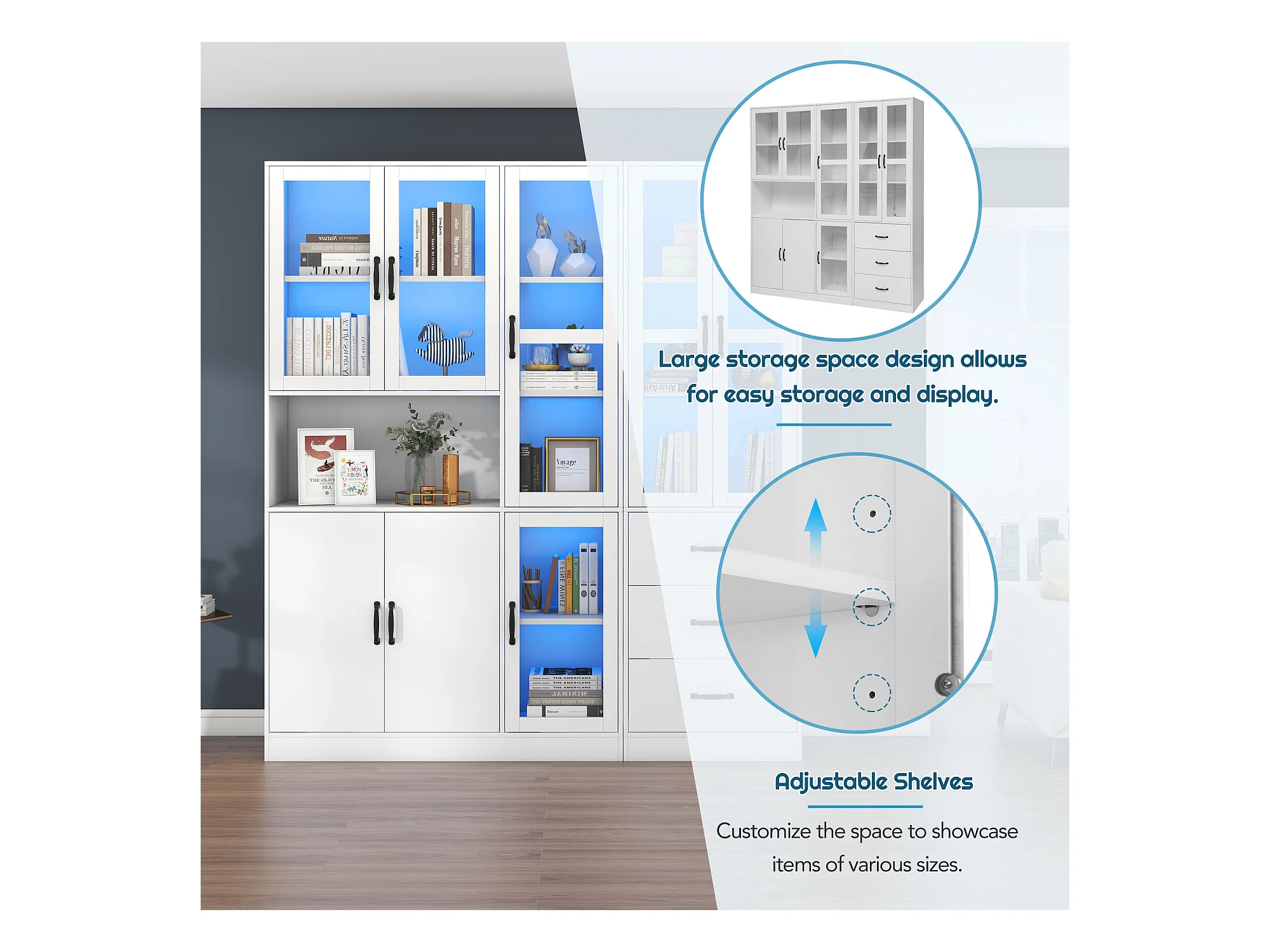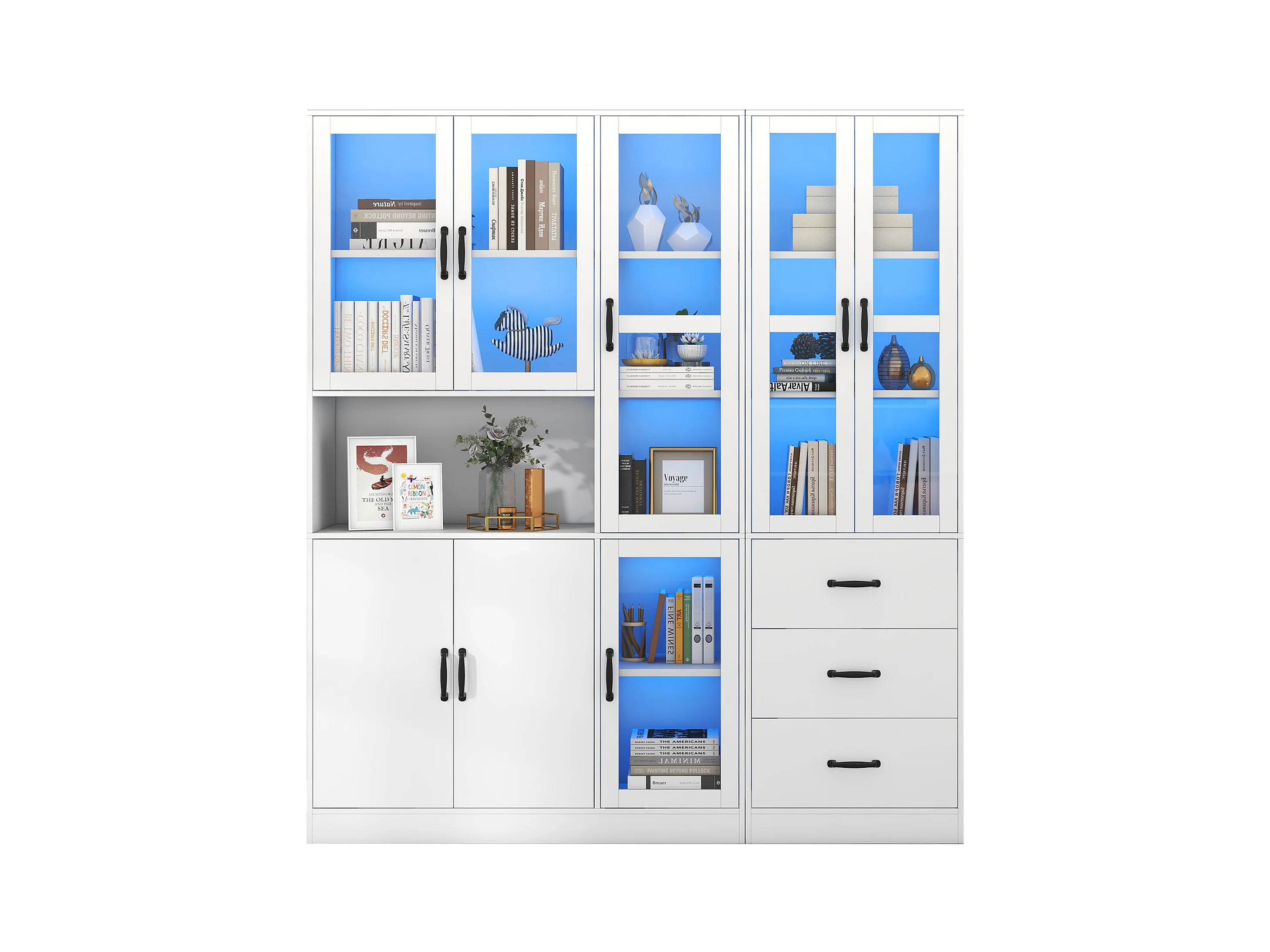 Vitrina moderna combinada con iluminación LED, 8 puertas, 3 cajones, aglomerado, blanco, 180x40x200 cm