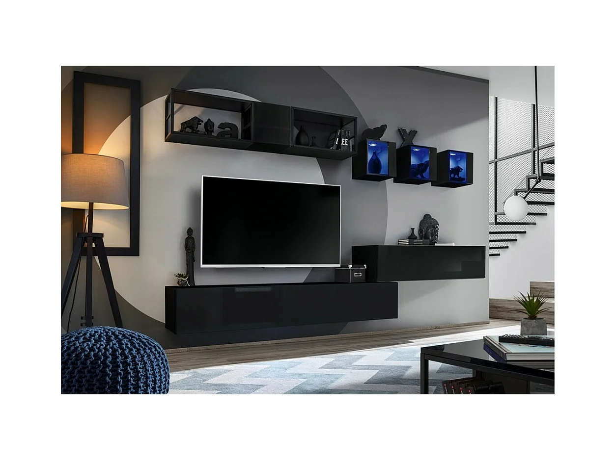 Vitrina negra cuadrada suspendida con 1 puerta de vidrio y luz LED incluida. Colección SWITCH.