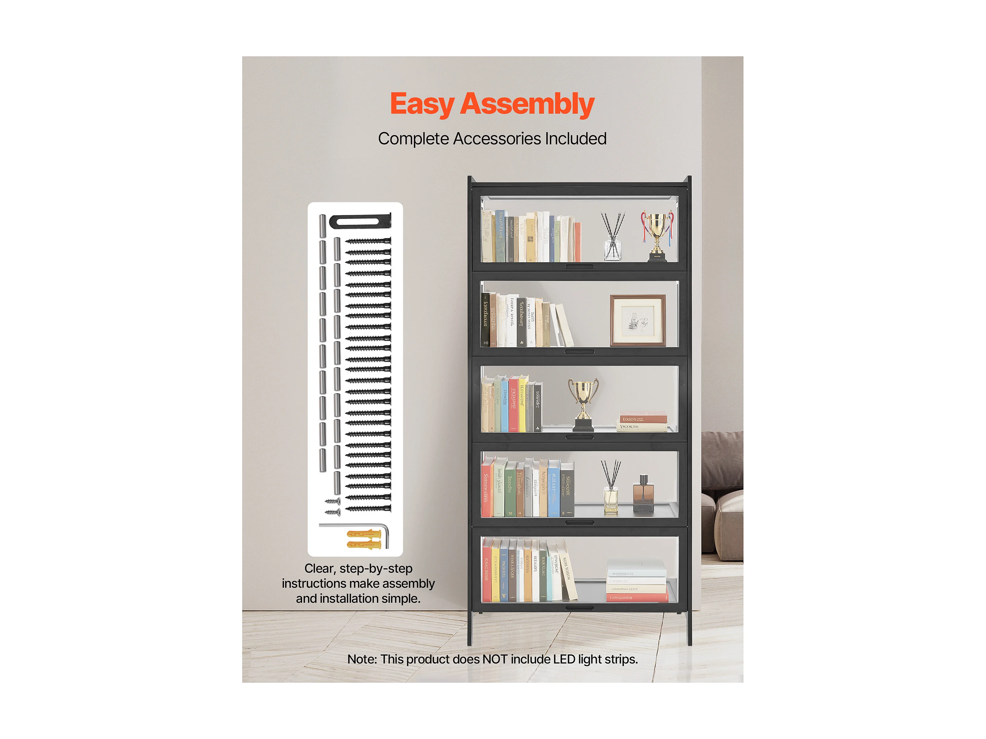 Vitrina lacada con LEDs + 1 estante de cristal + puerta - 61 x 42 x 162 cm - aglomerado - negro