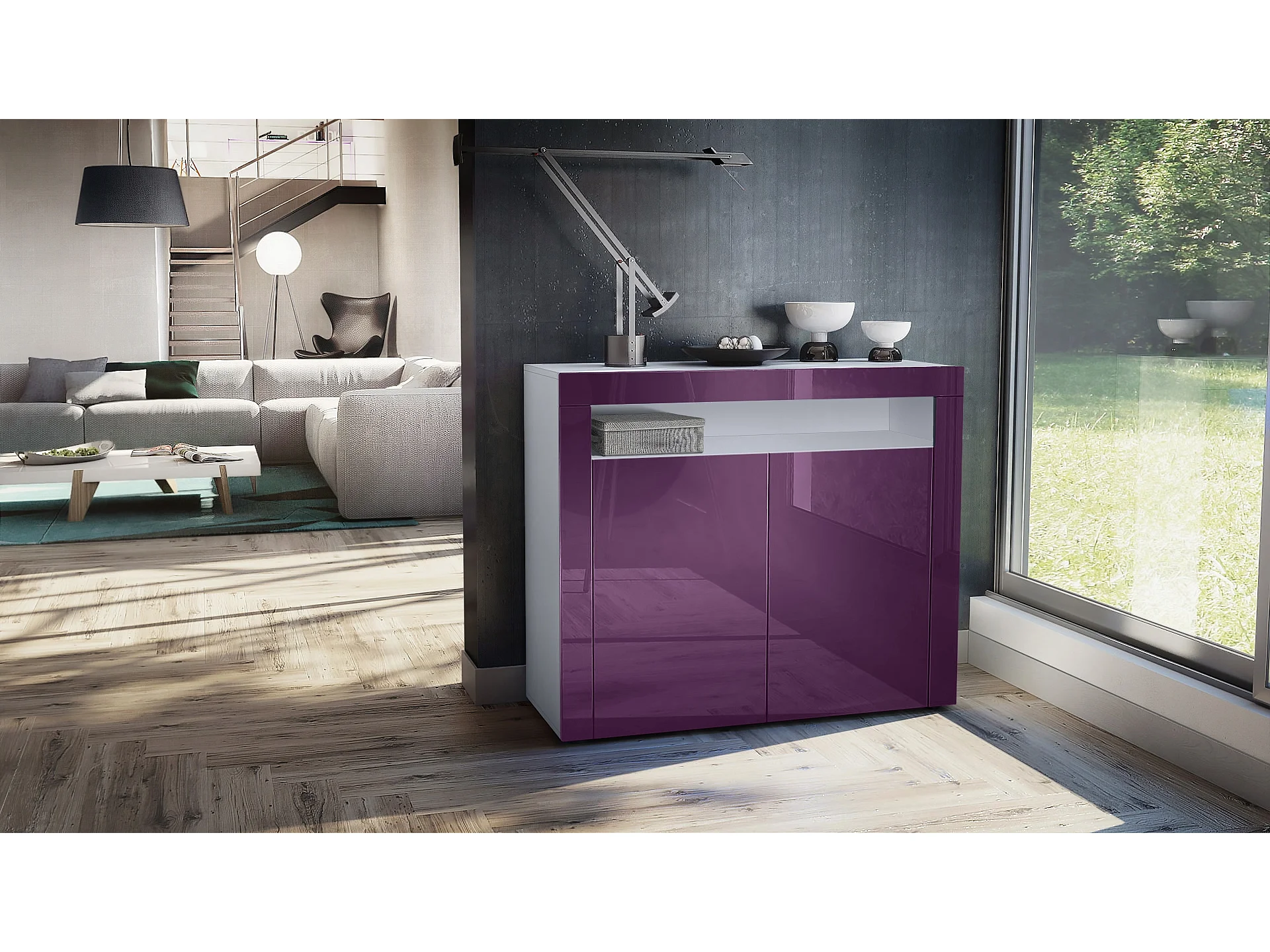 Aparador Metro, cuerpo en blanco de alto brillo, Frentes en blanco de alto brillo con inserción en compartimento abierto en zarzamora de alto brillo