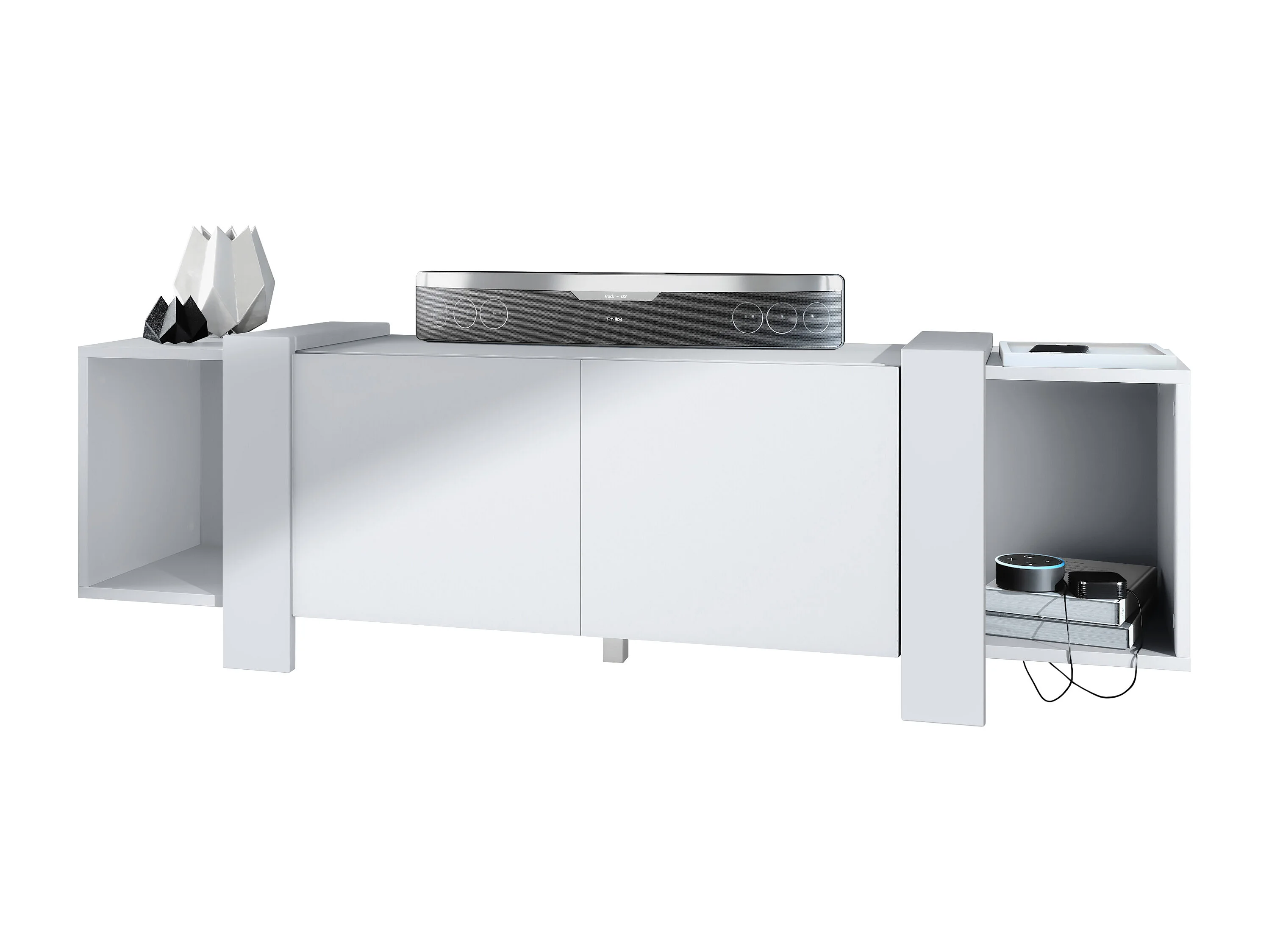 Mesa baja para TV Metro, cuerpo en blanco de alto brillo / Frente en blanco de alto brillo con inserción en compartimento abierto en blanco de alto brillo