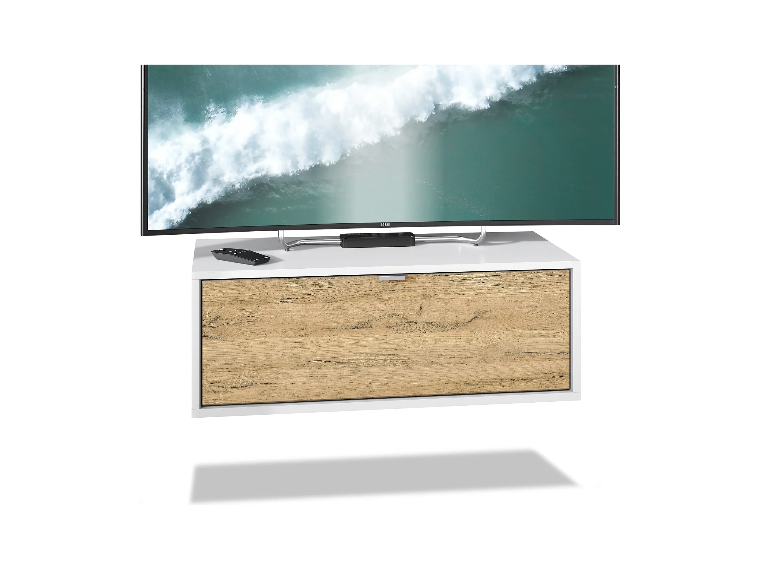 Mueble televisor Lana 100 Mueble de pared para televisión 100 x 29 x 37 cm, Cuerpo en Blanco Mate, Frentes en Roble natural | Gran variedad de colores