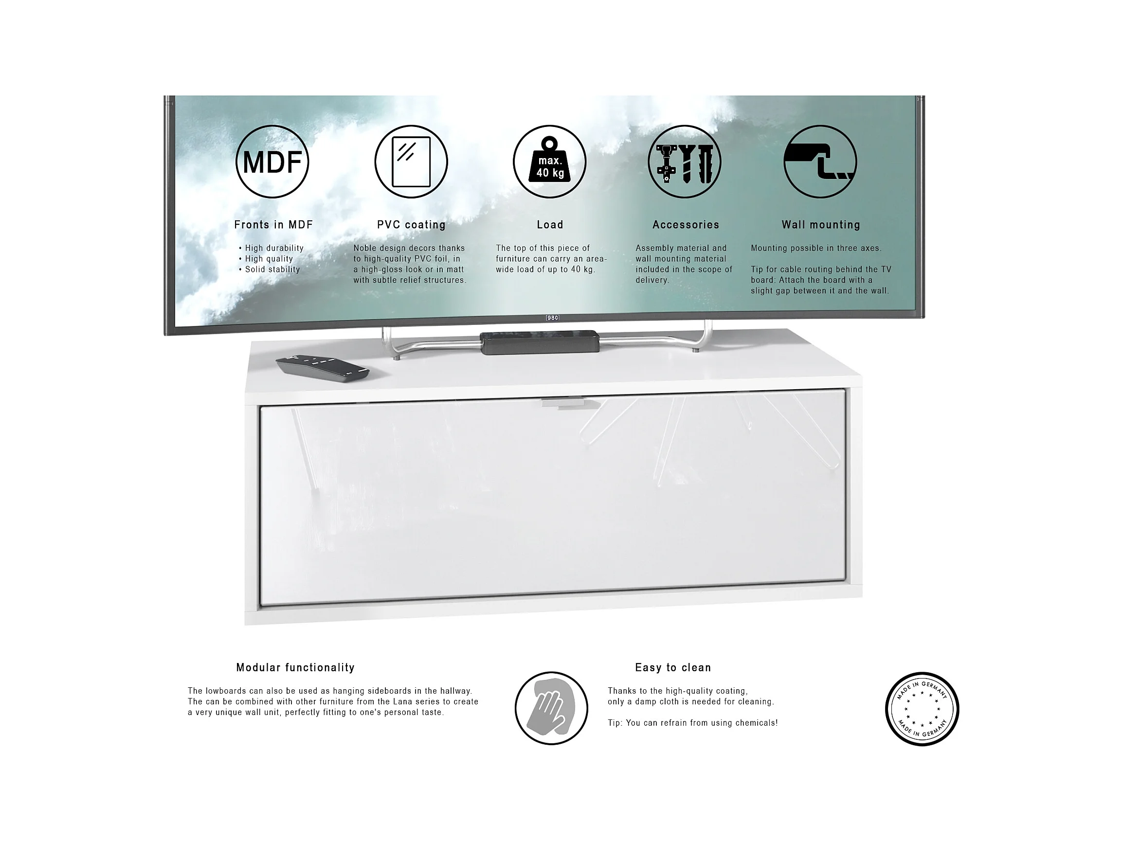 Mueble televisor Lana 120 Mueble de pared para televisión 120 x 29 x 37 cm, Cuerpo en Blanco Mate, Frentes en Gris arena de alto brillo | Gran variedad de colores