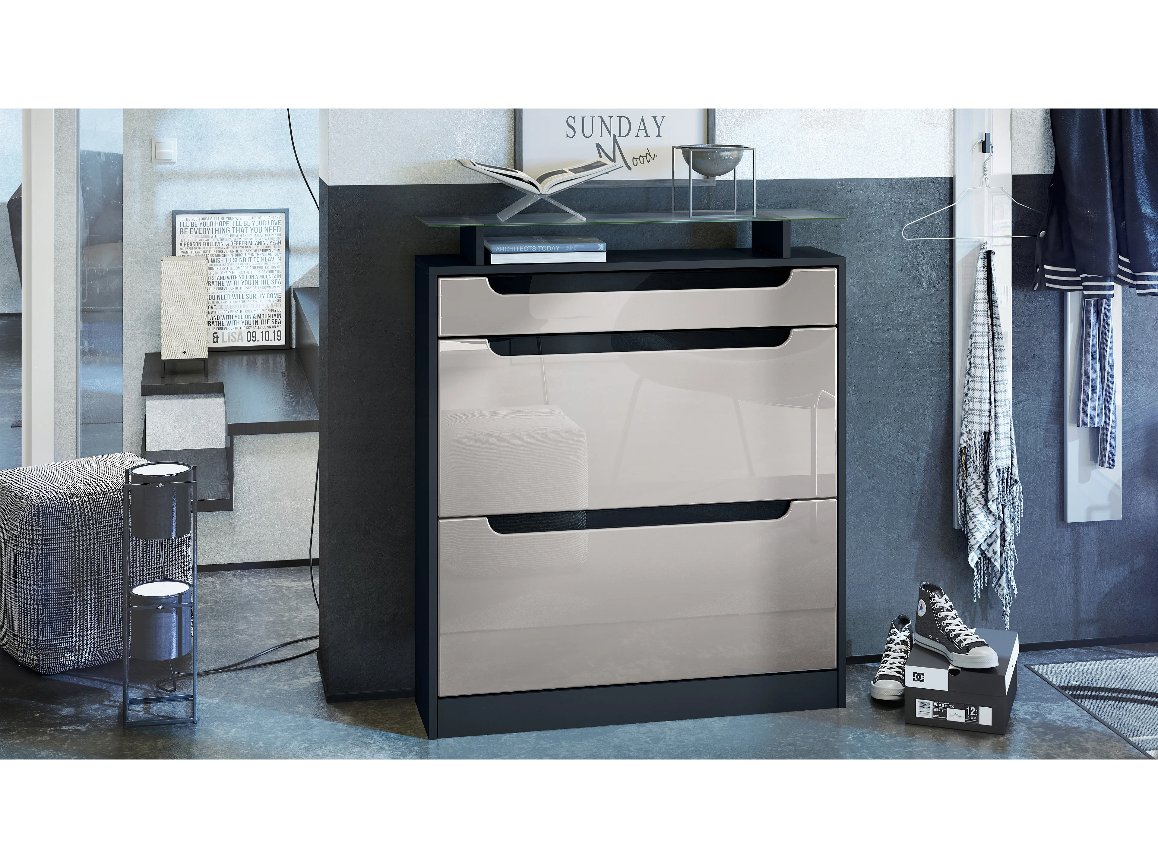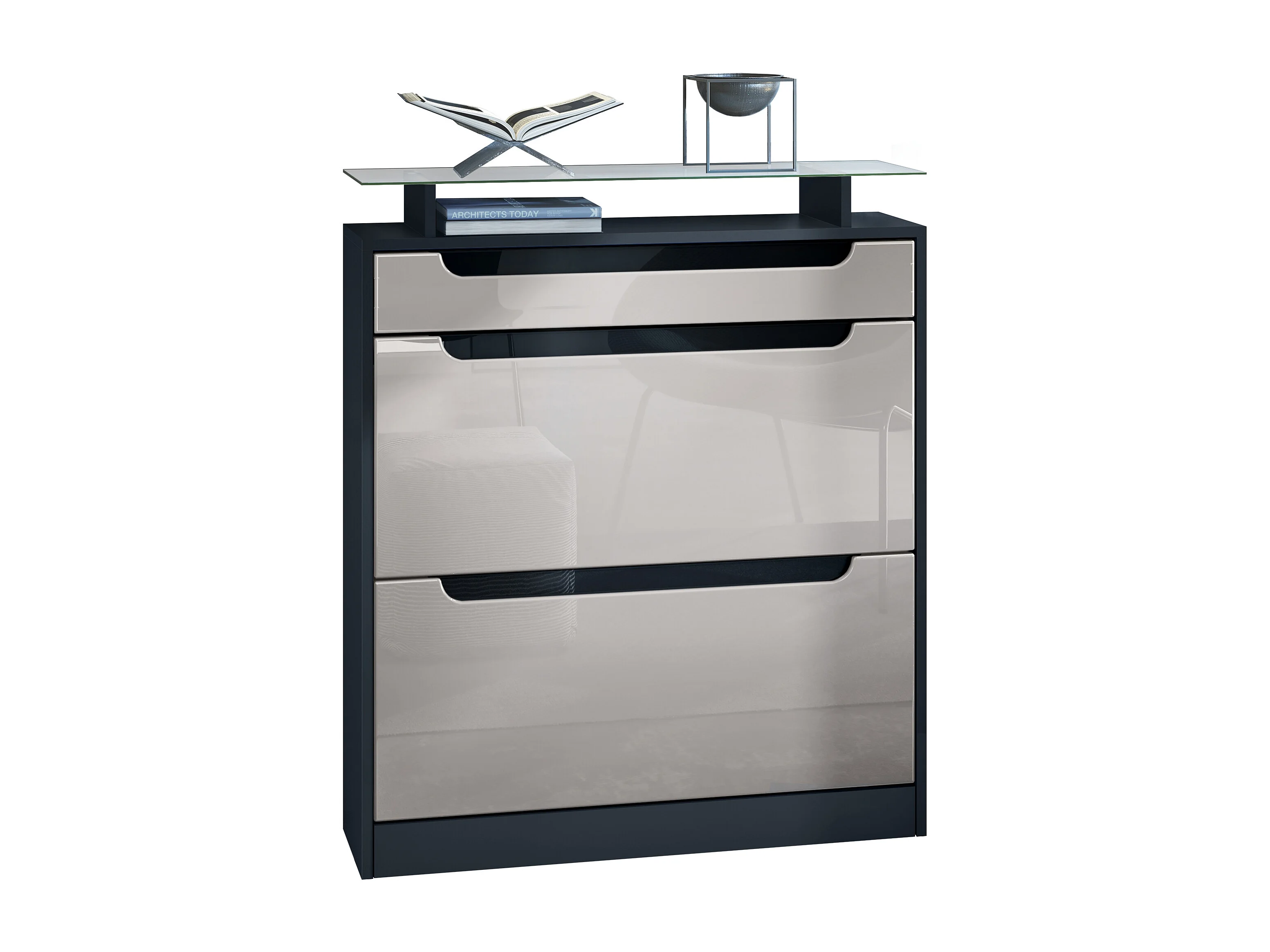 Zapatero Space, zapatero para 24 pares de zapatos con 3 puertas abatibles y estante de vidrio, antracita mate/gris arena de alto brillo (89 x 128 x 23 cm)