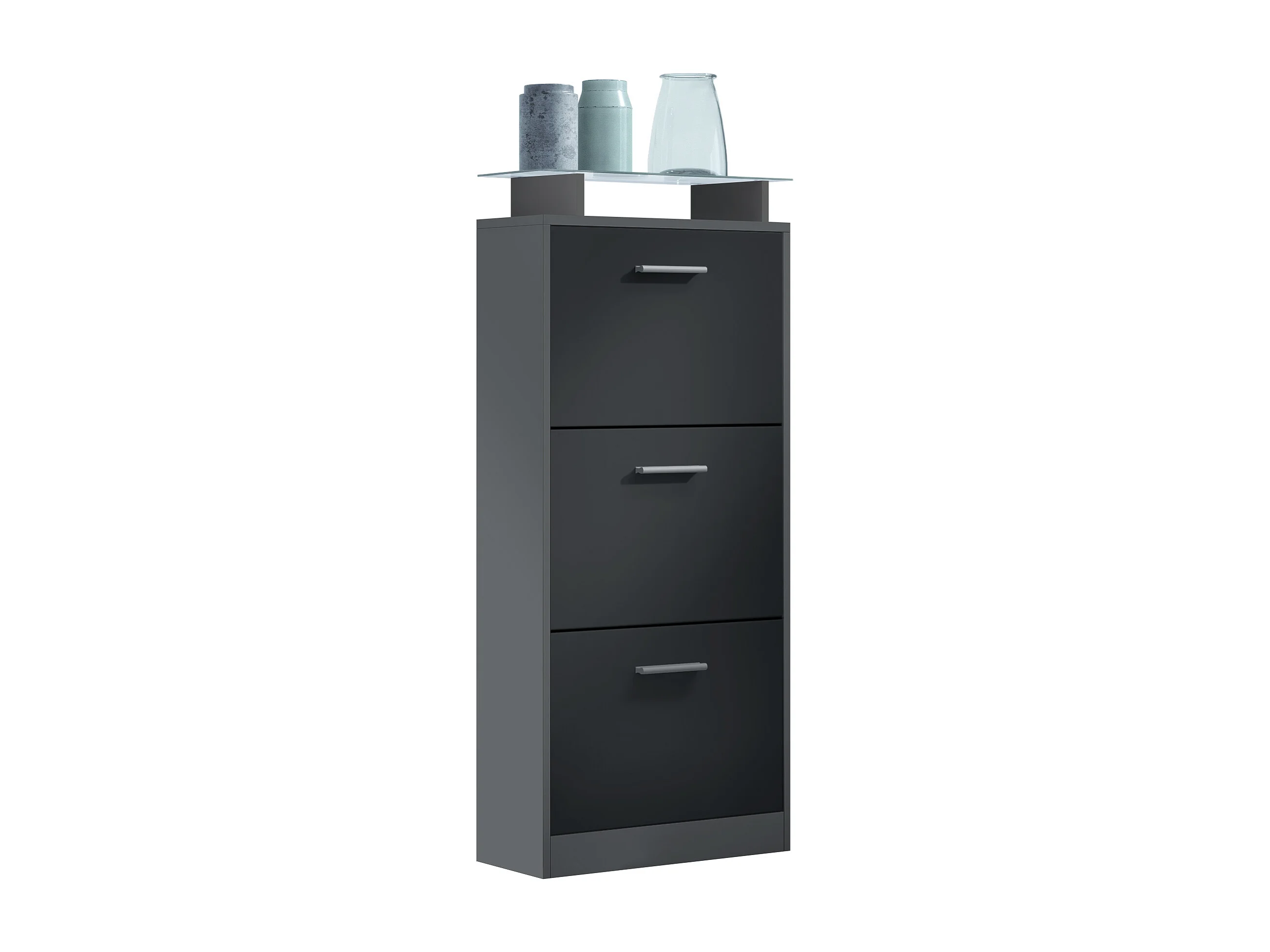 Zapatero Space, zapatero para 24 pares de zapatos con 3 puertas abatibles y estante de vidrio, antracita mate/negro de alto brillo (89 x 128 x 23 cm)