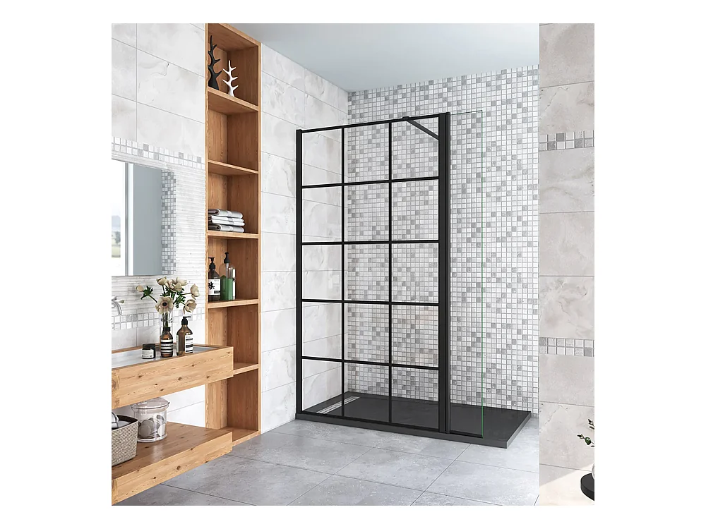 Walkin Mampara Panel de ducha Serigrafiado de celosía cuadrada 2hojas Vidrio 8mm Antical con Barra1 Negra 90cm Tamaño[(123.9-125.9)+40]x200cm-AICA