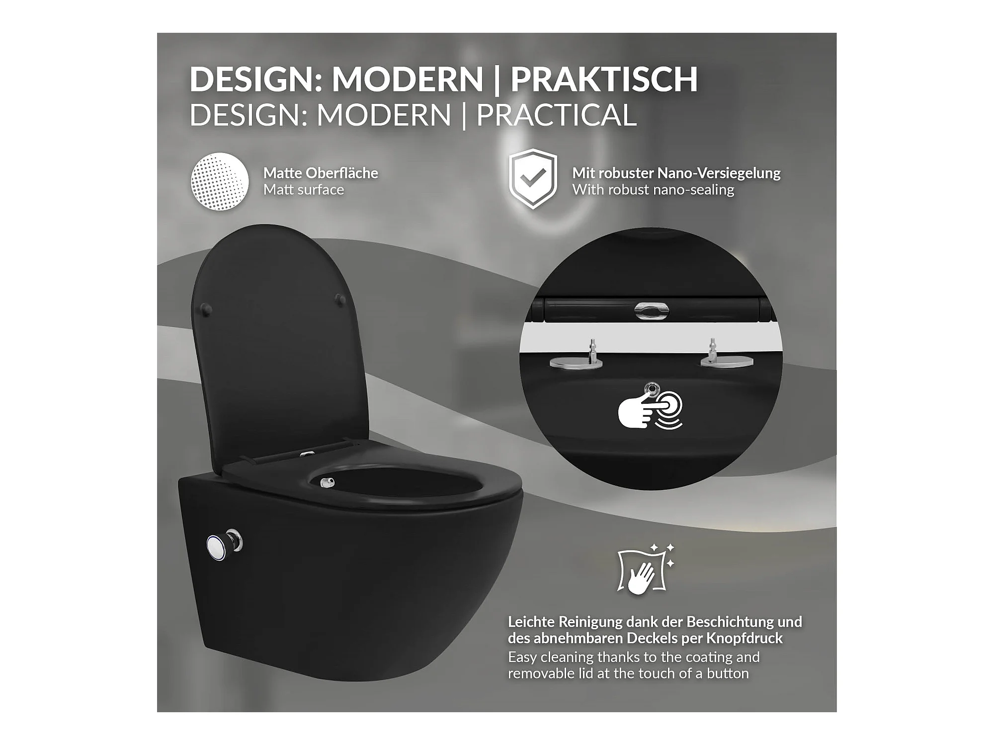 WC cerámico suspendido nanorecubrimiento función bidé negro largo 53,5cm