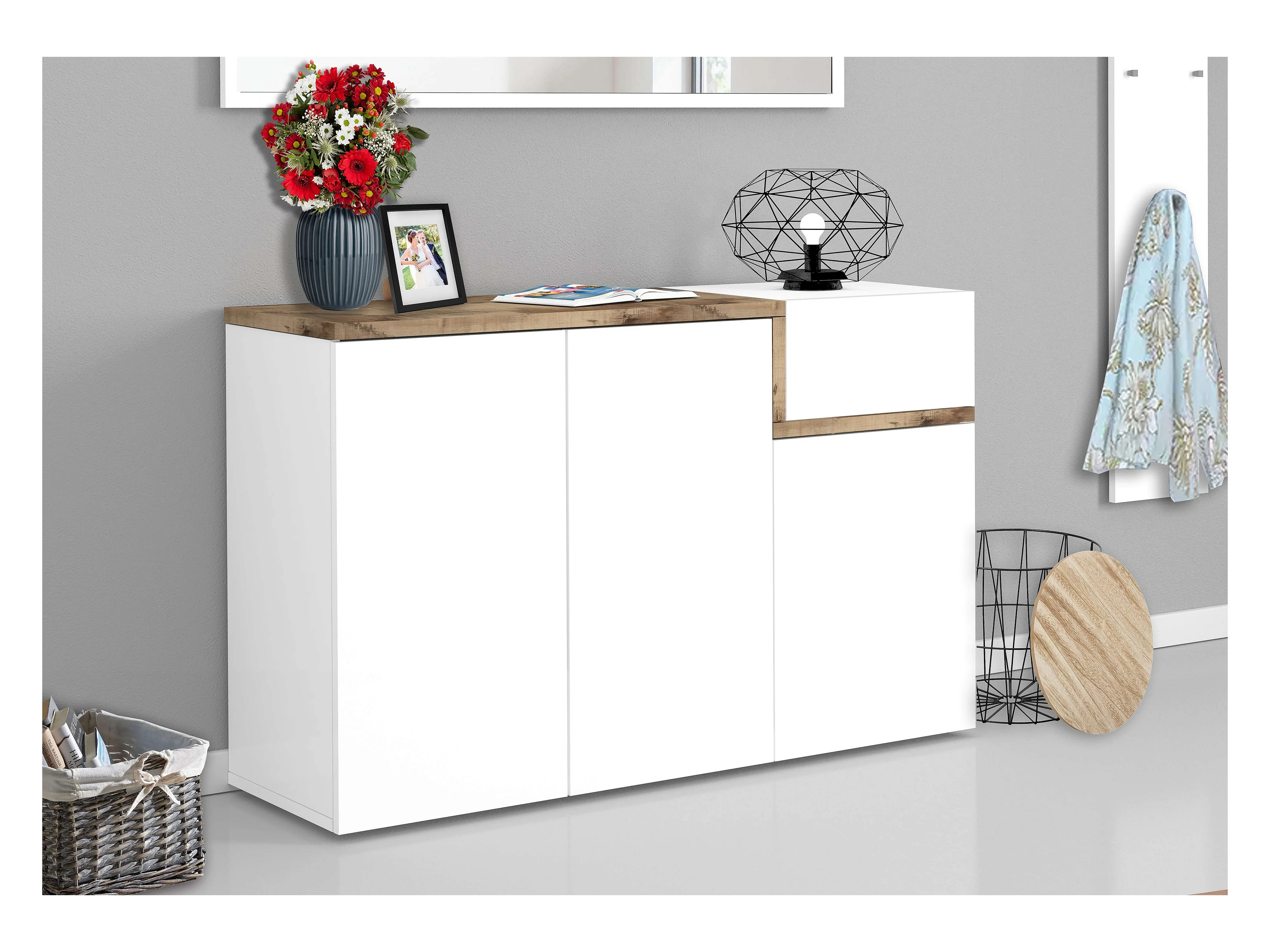 Aparador Sebastiano, Aparador de cocina con 1 puerta y 3 cajones, Buffet de salón, 100% Made in Italy, 110x40h47 cm, Blanco brillo