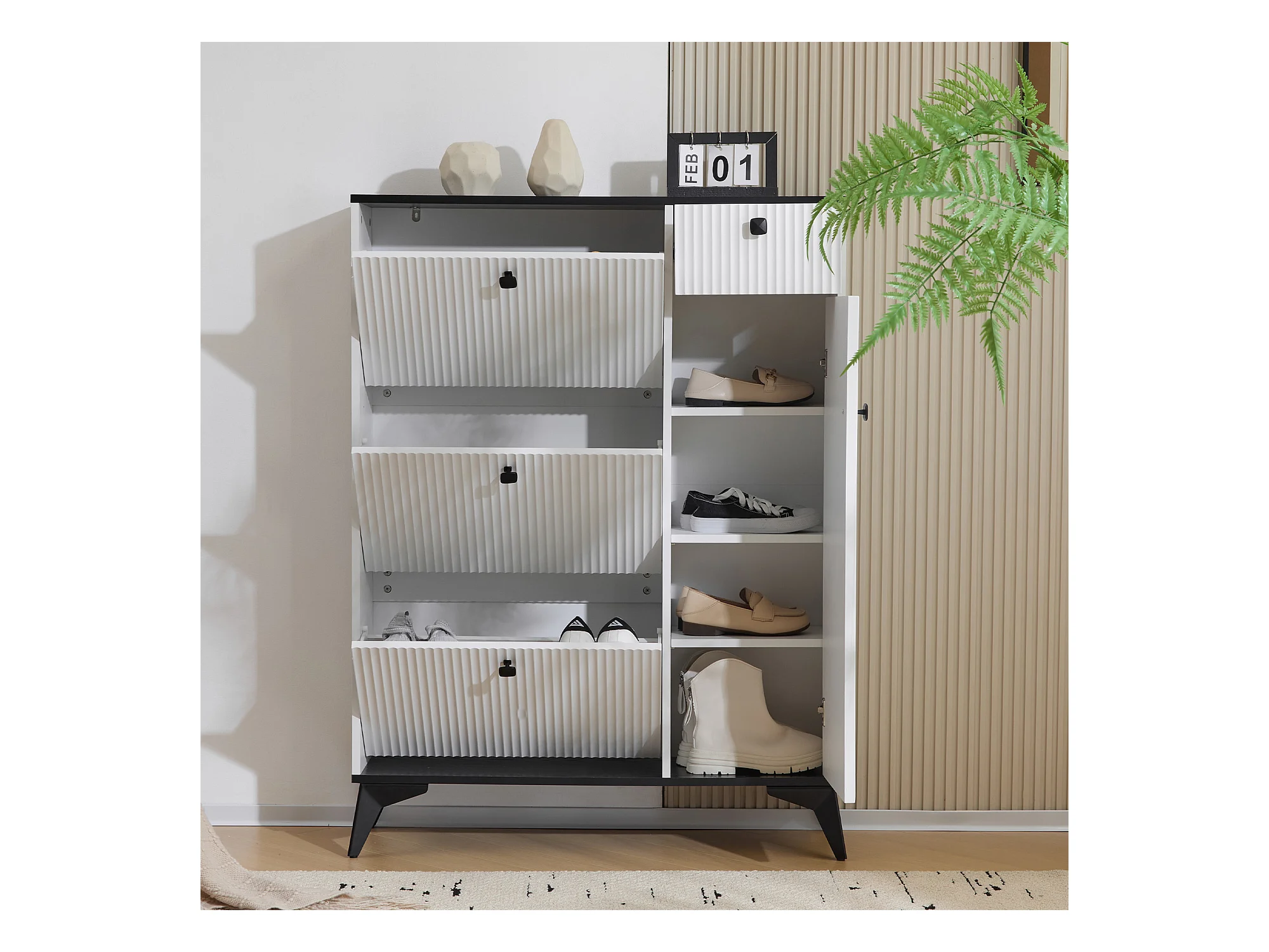 Zapatero blanco con 1 cajón y 4 puertas, patas negras 90x25x121cm