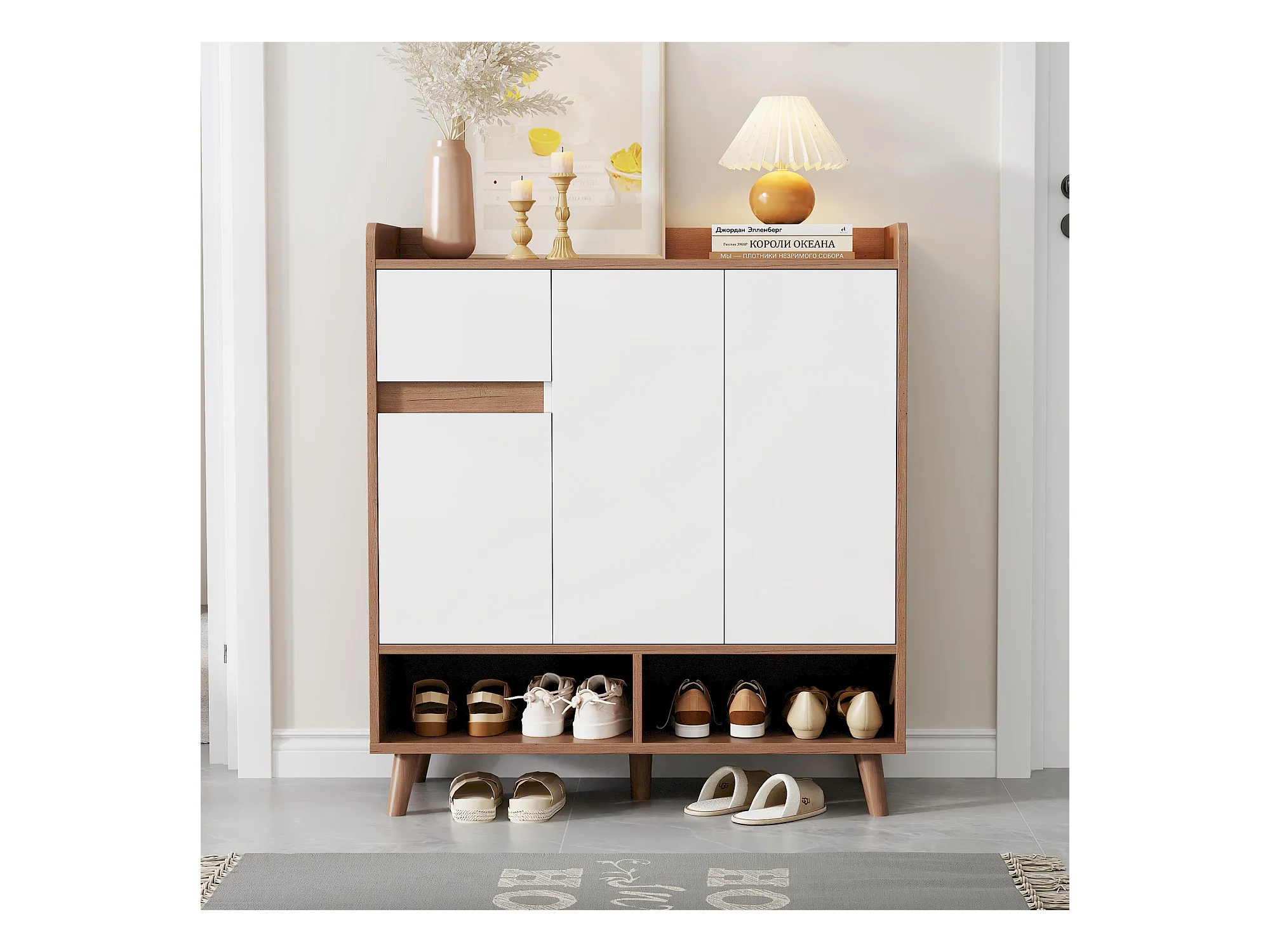 Zapatero blanco y madera con 3 puertas y 1 cajón, estantes regulables 90x35x99cm