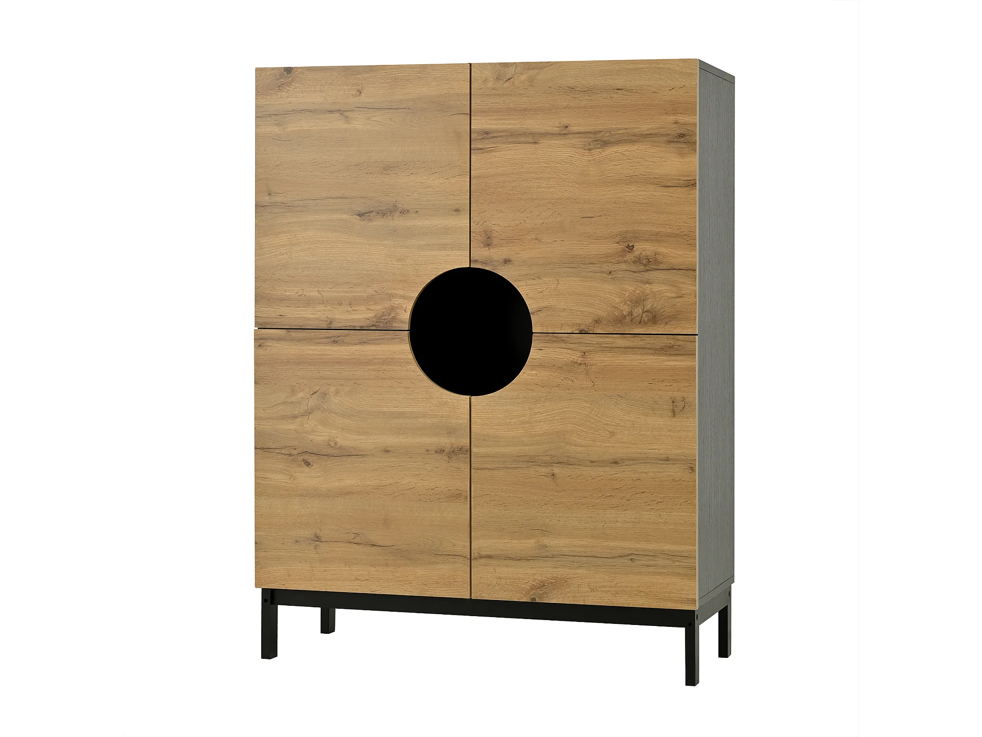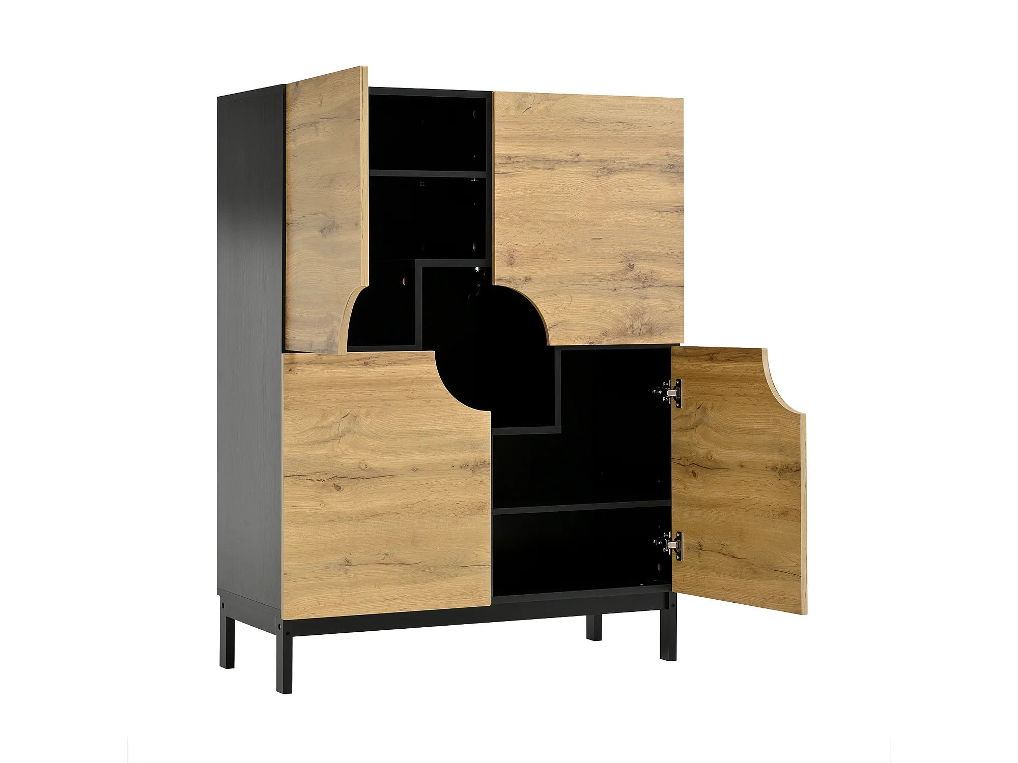 Zapatero con 4 puertas, luces LED, estantes ajustables, color natural y negro.