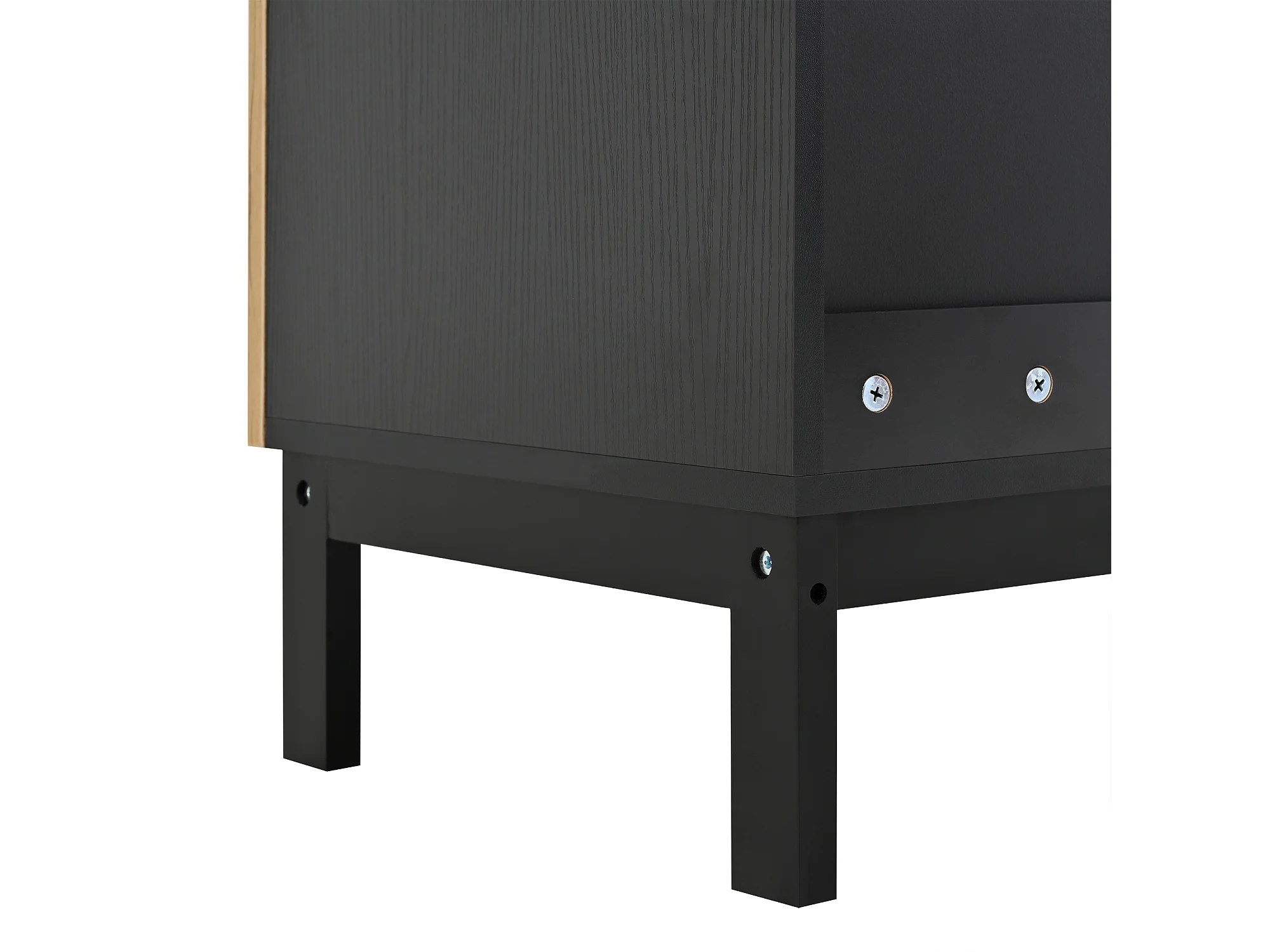 Zapatero con dos puertas a rayas, patas de metal negro, acabado natural