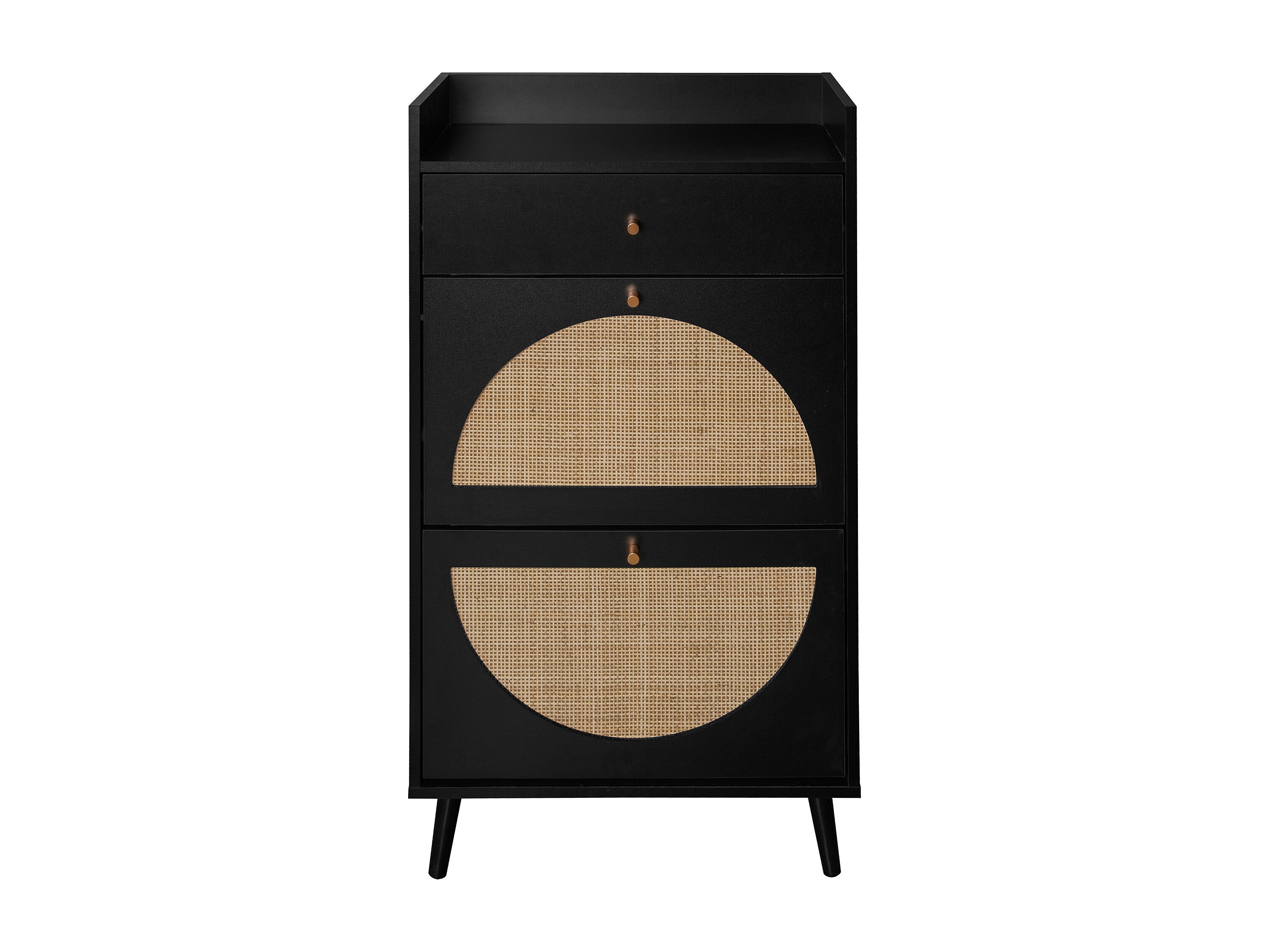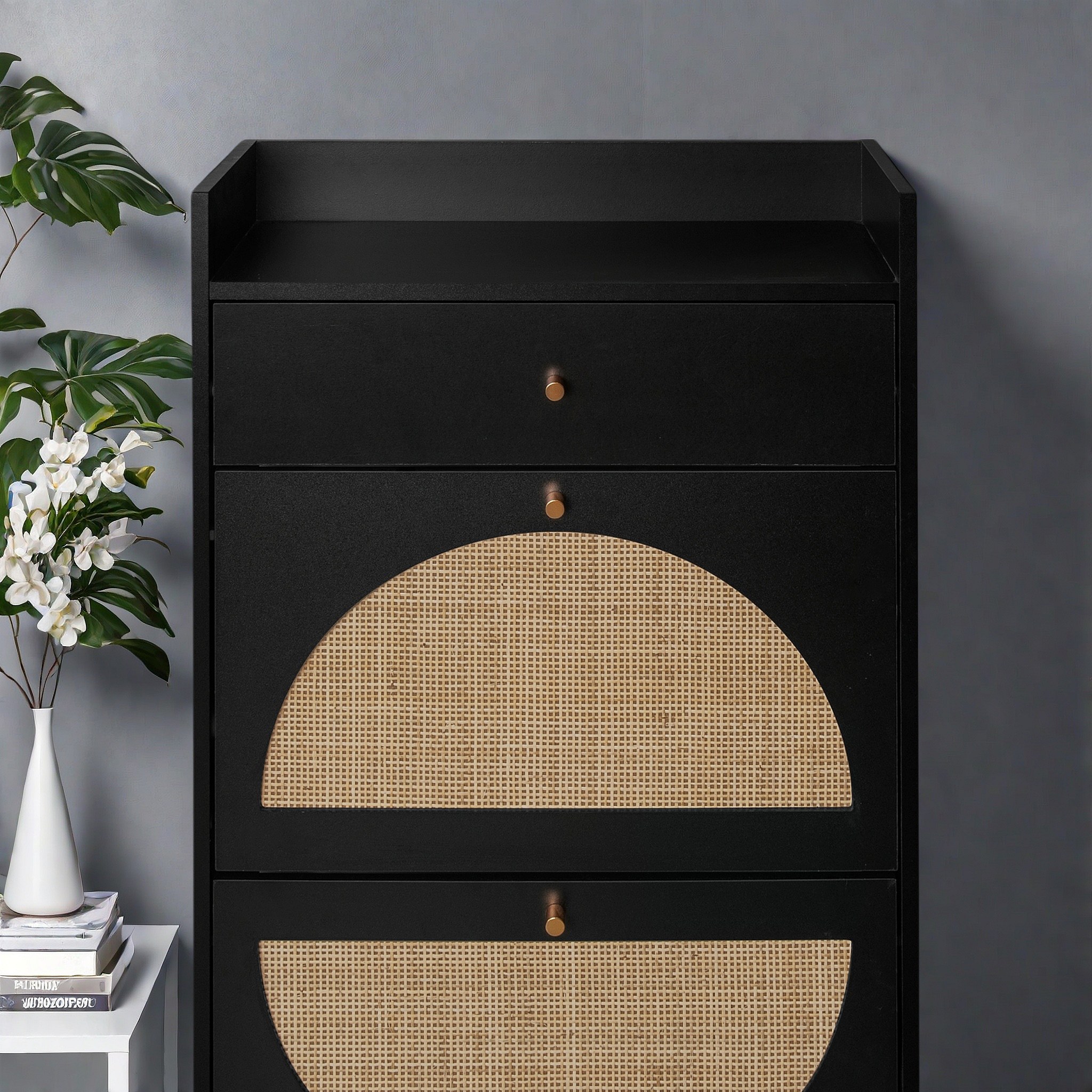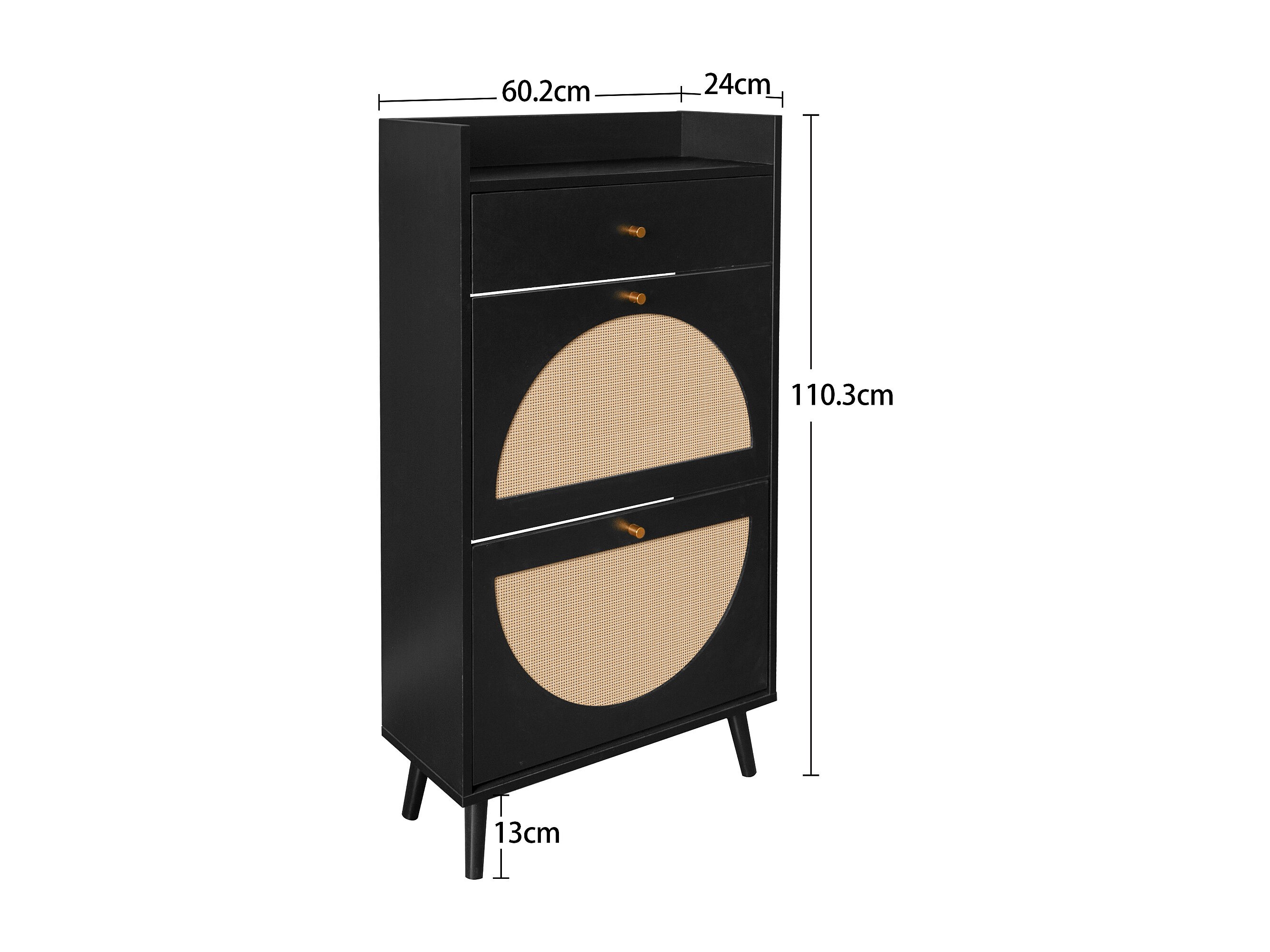 Zapatero con dos puertas y un cajón en negro, imitación ratán, 60 cm, sin panel trasero, ideal para pasillos y zonas similares.