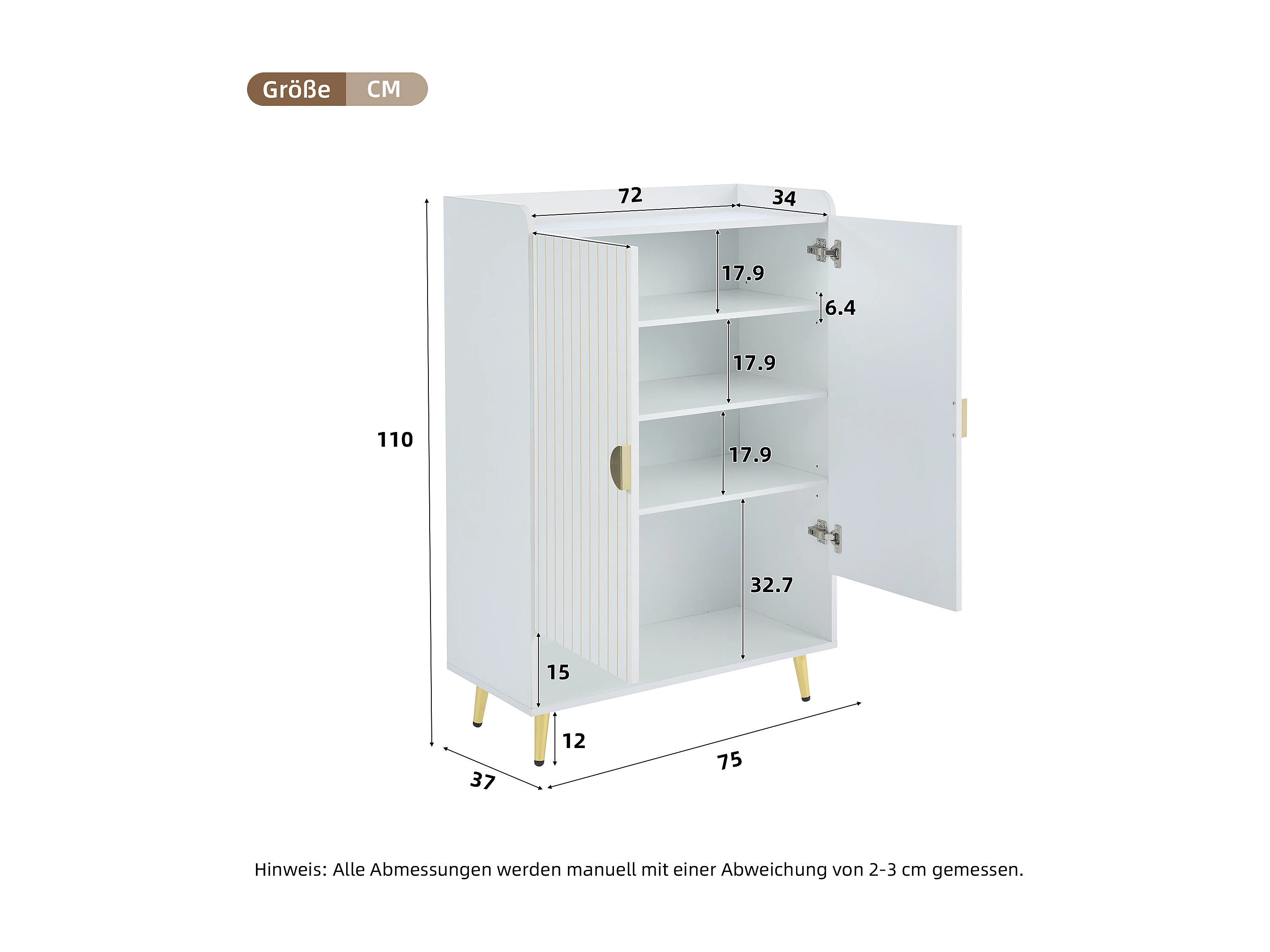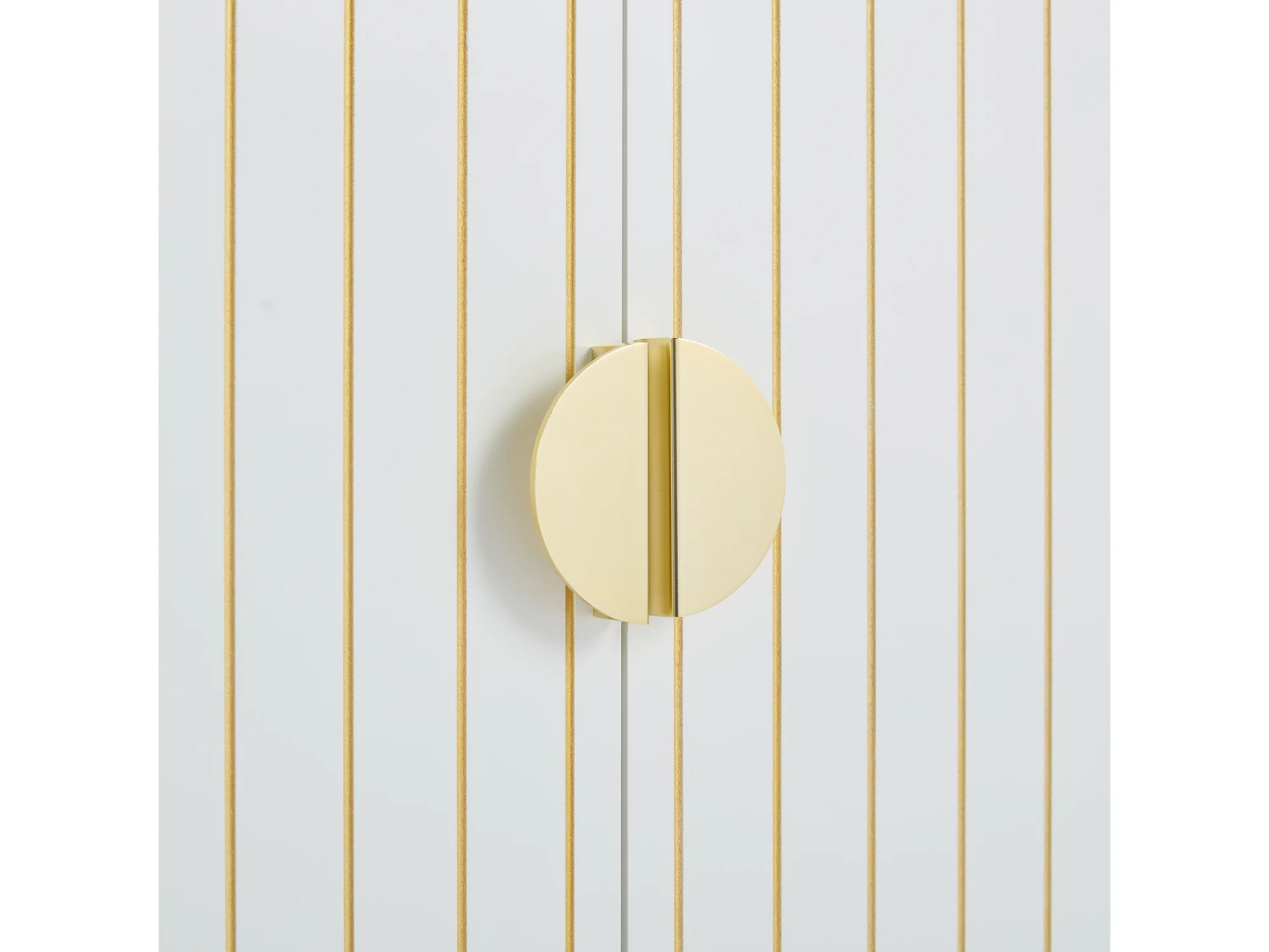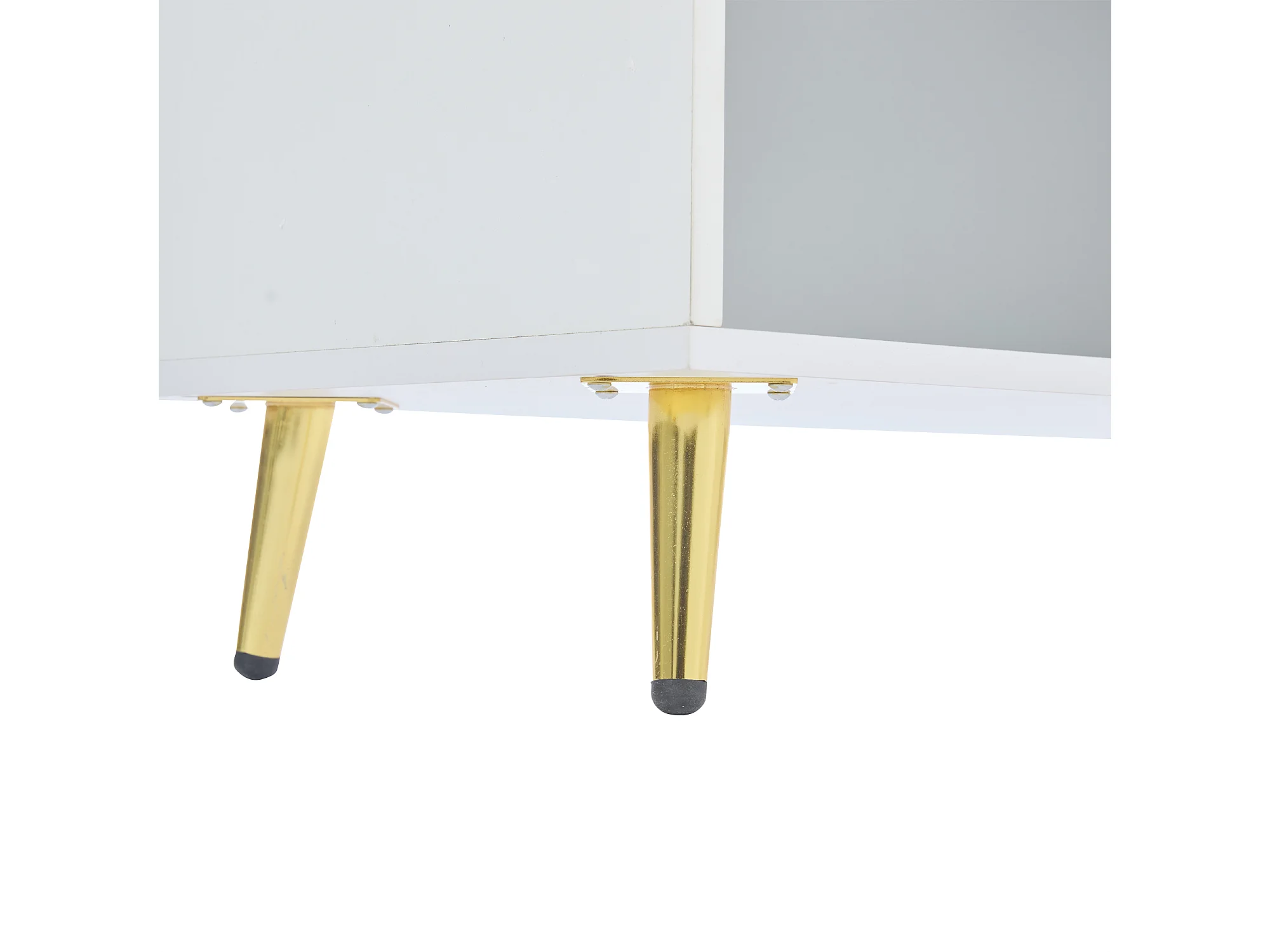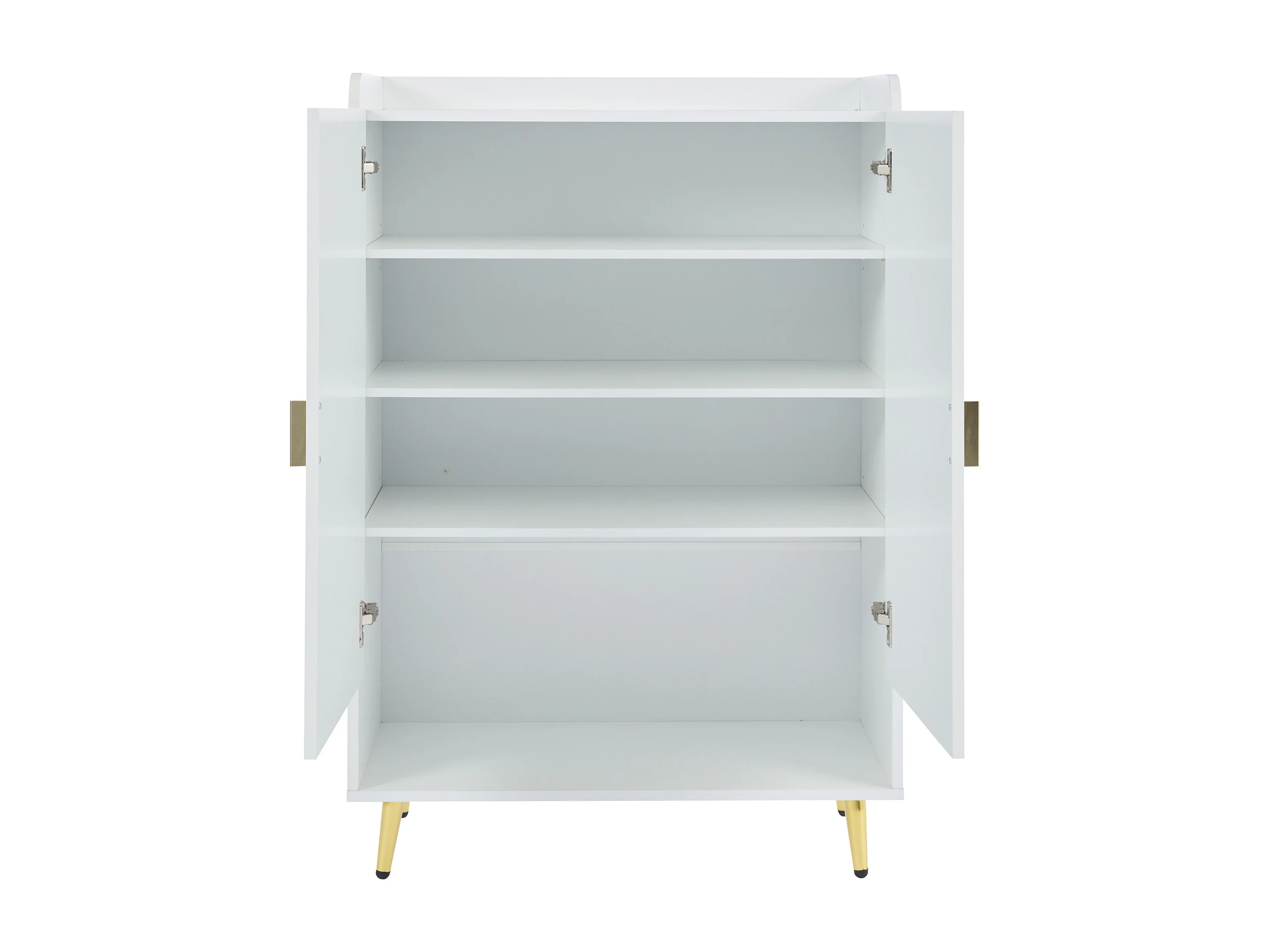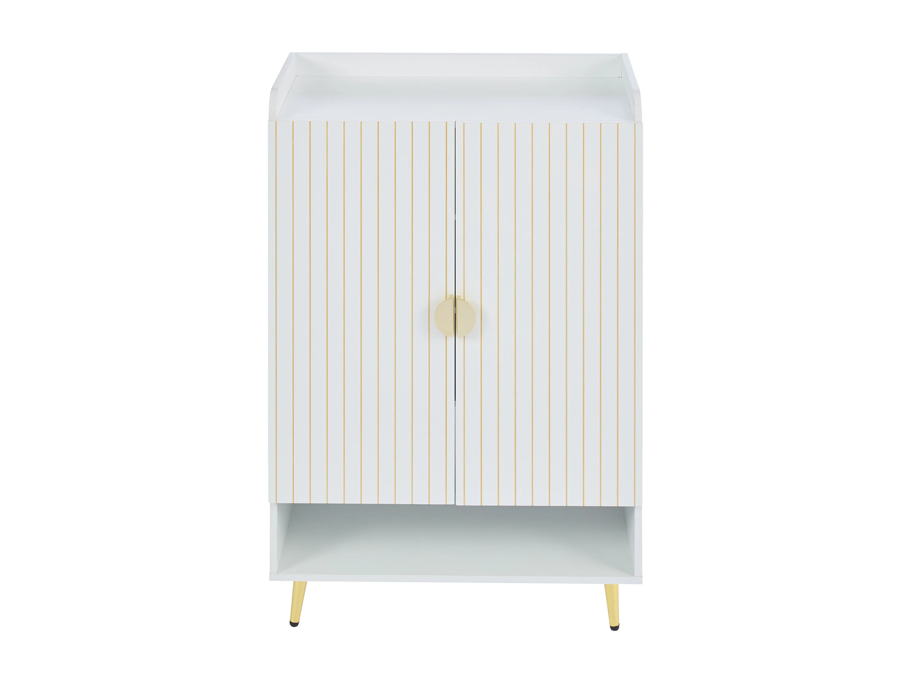 Zapatero blanco con 2 puertas y estantes abiertos, tiradores y patas dorados