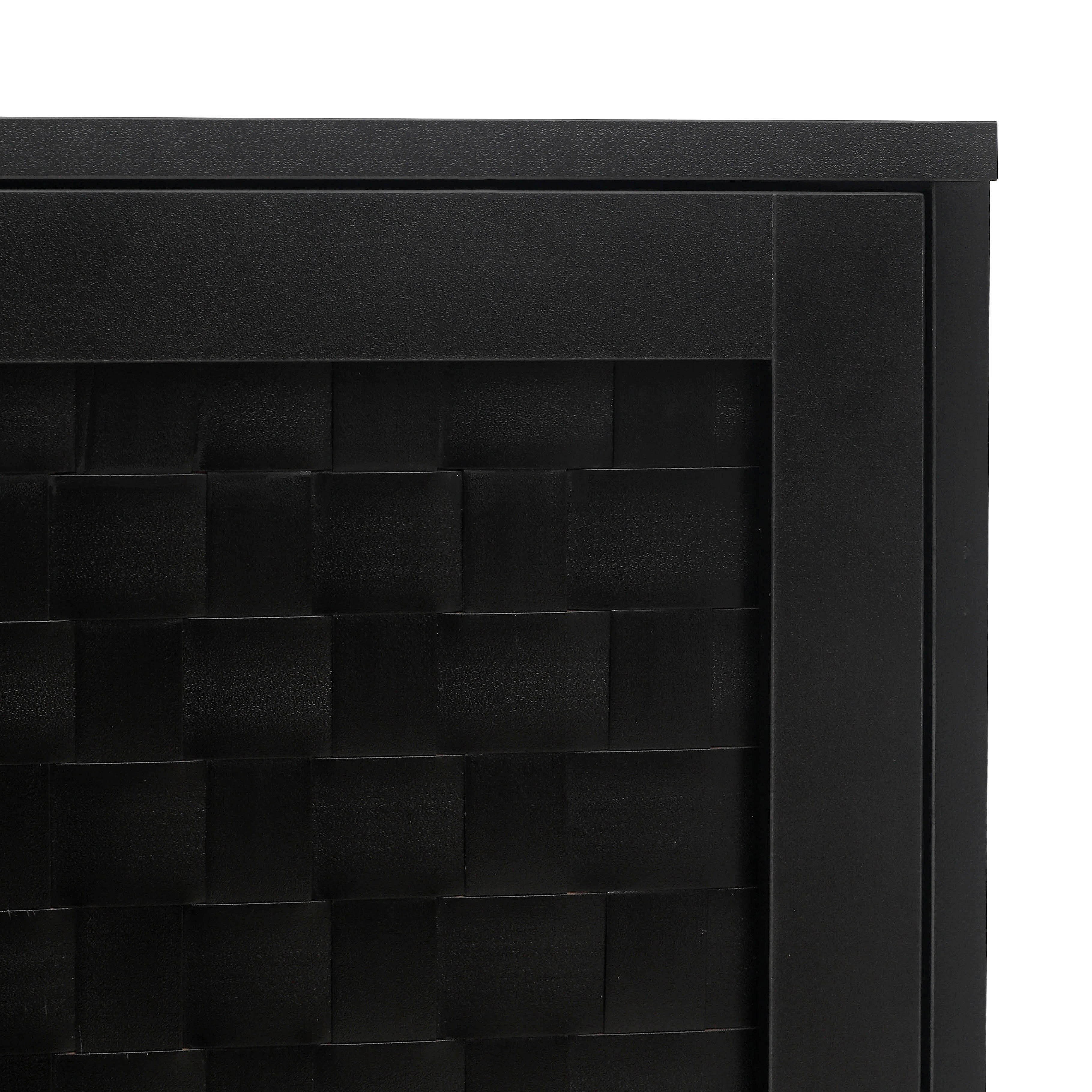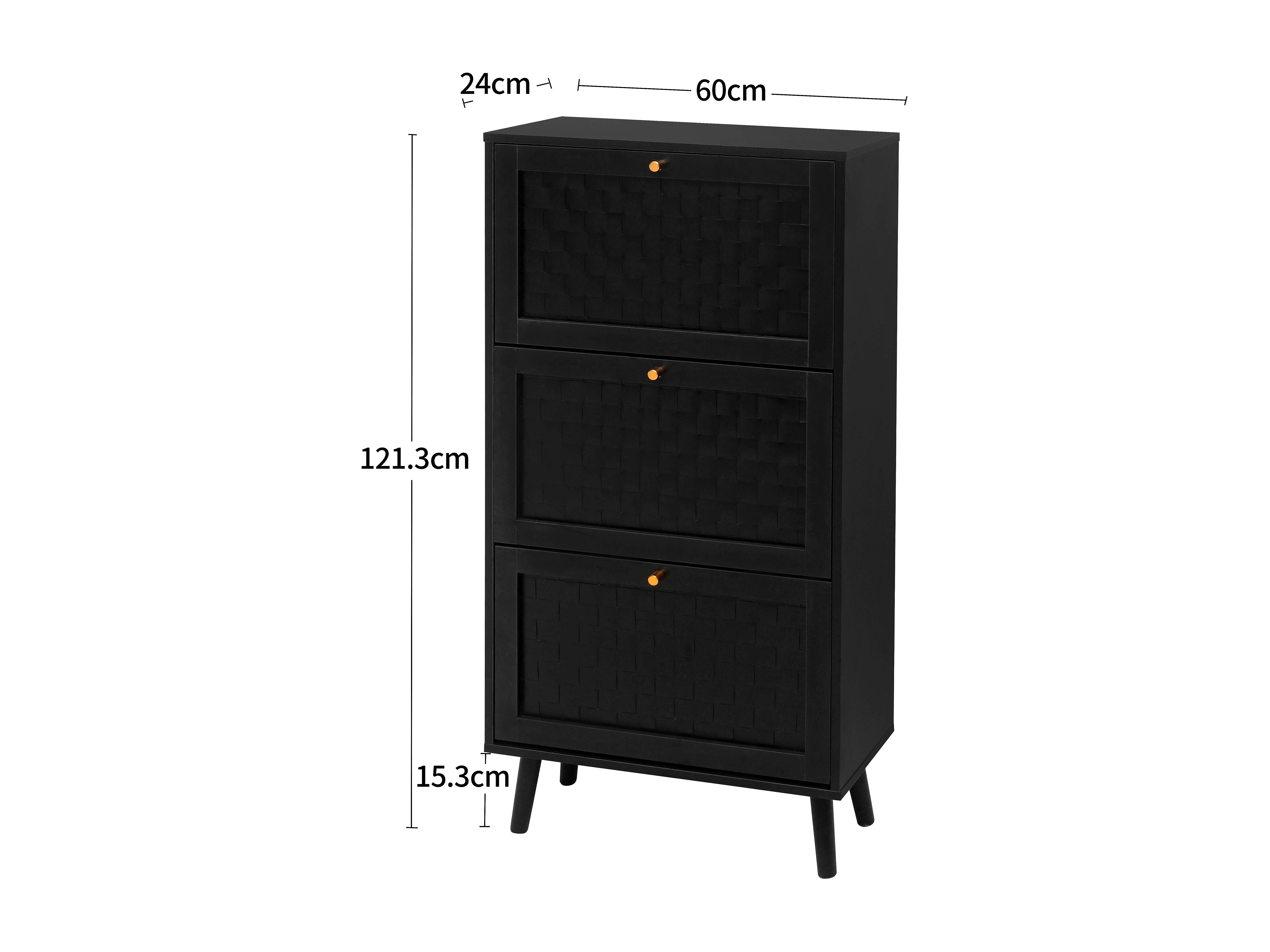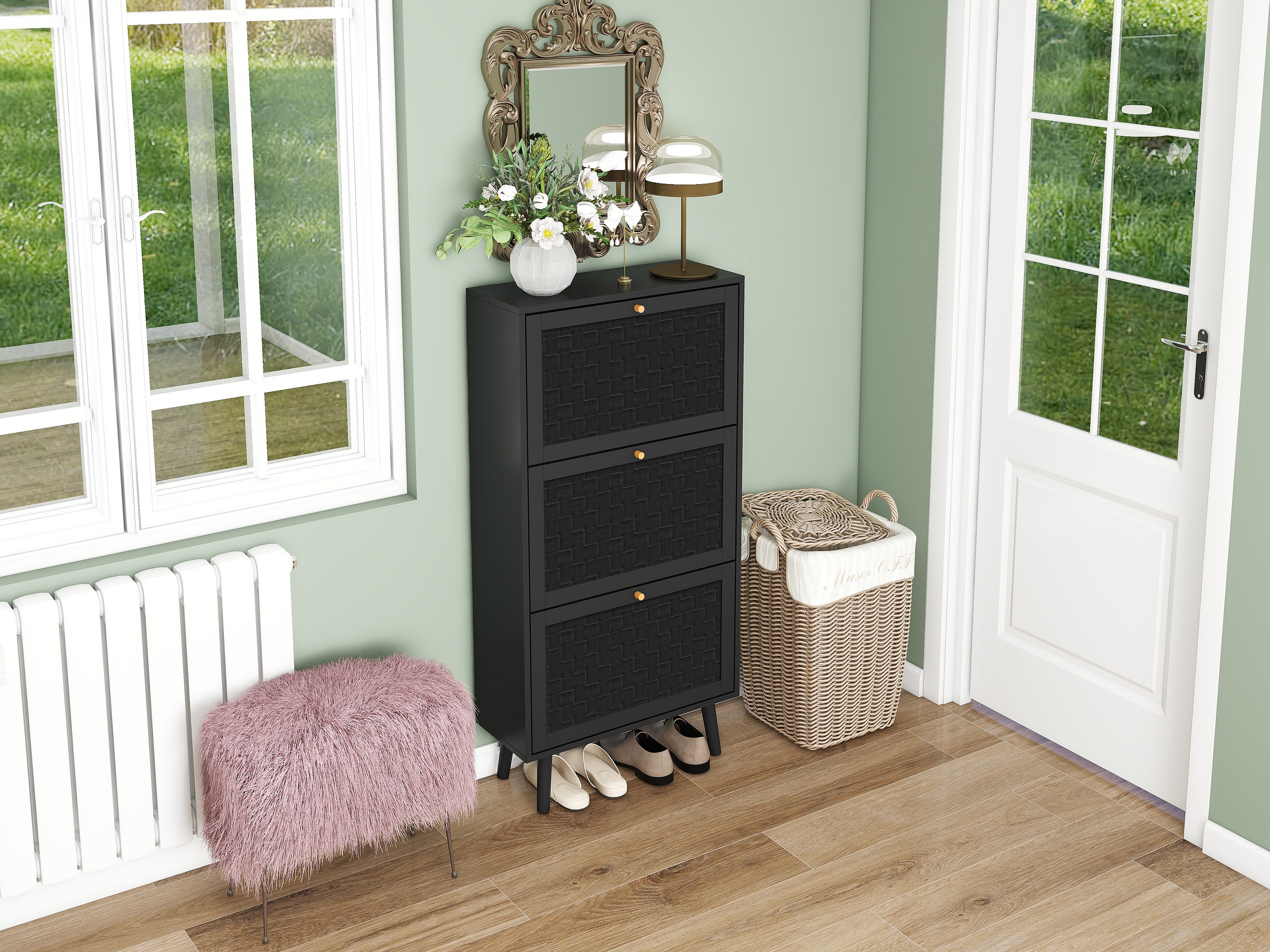 Zapatero con dos puertas y un cajón en negro, imitación ratán, 60 cm, sin panel trasero, ideal para pasillos y zonas similares.