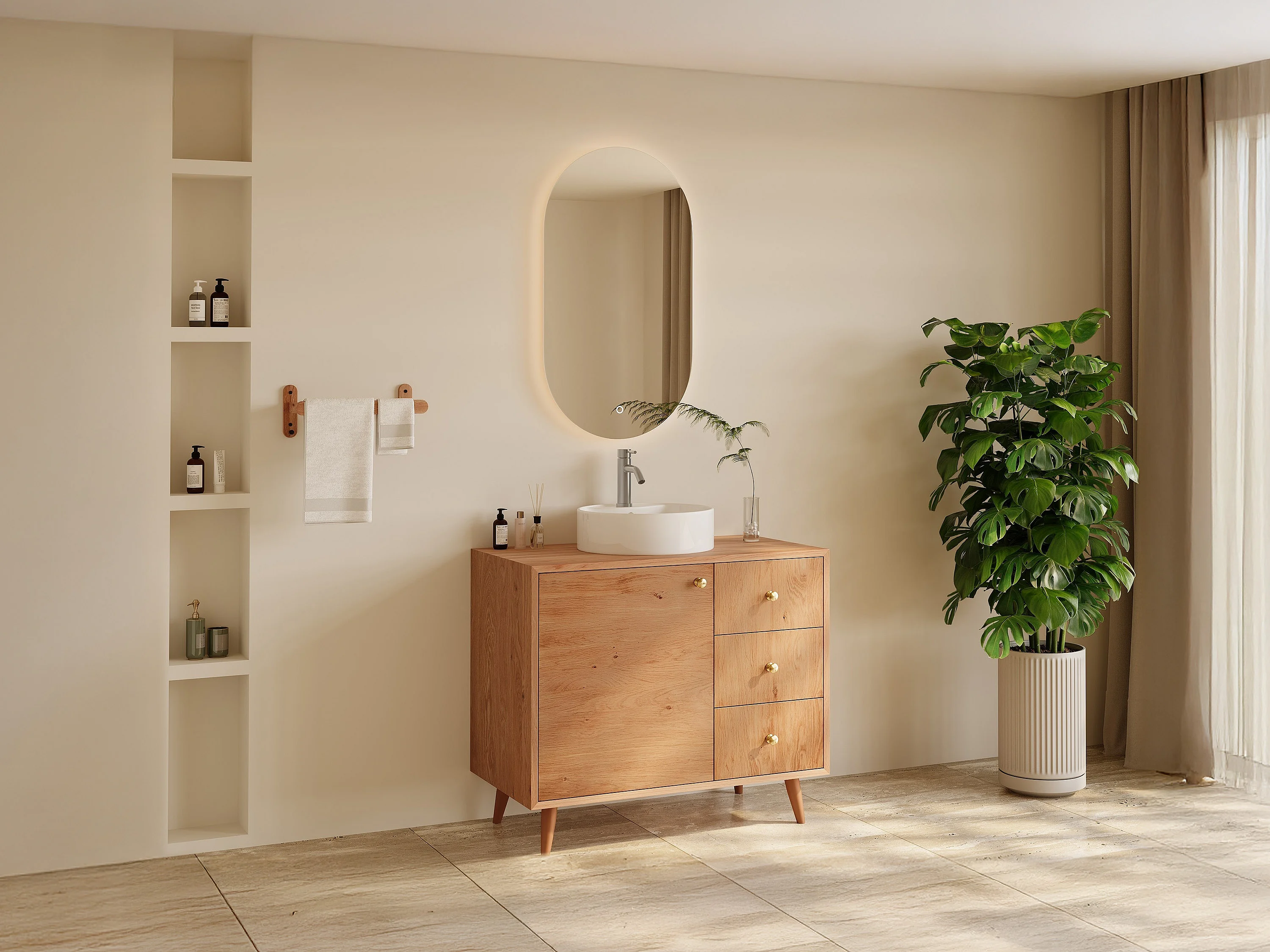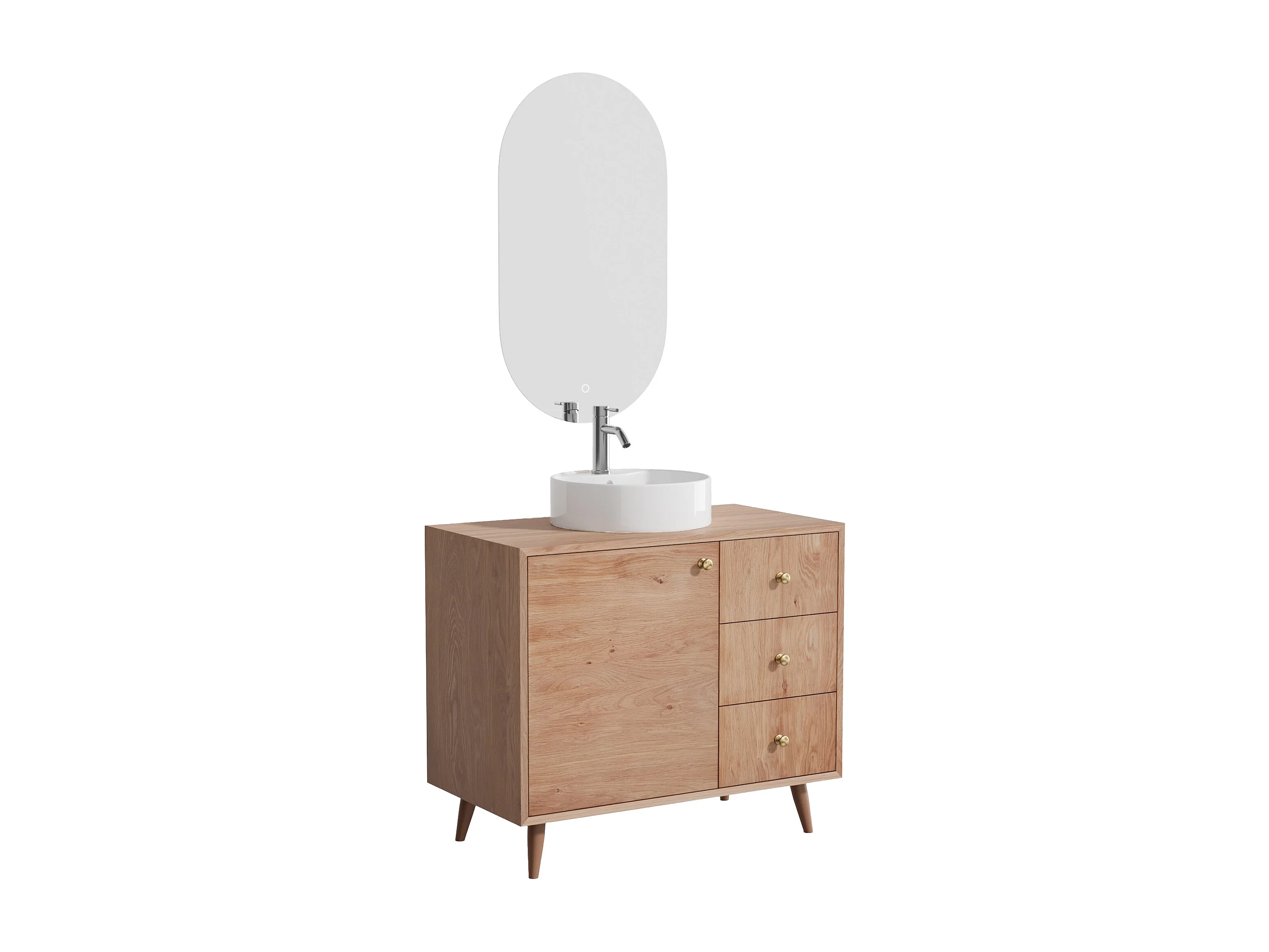 Mueble de baño de roble macizo con lavabo redondo sobre encimera, espejo y grifo - Natural claro - 93 cm - ZARENO